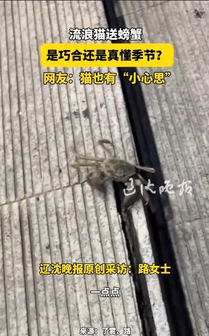 解释不清了!9月25日,辽宁沈阳,一女子经常投喂流浪猫,没想到,这天晚上流浪猫来吃饭时,给女子带了一只活的螃蟹,不知道纯属巧合还是它真的懂季节,竟给女子送来一只螃蟹补身体!网友:万物皆有灵。 现在城市中生活着很多流浪猫狗,晚上人少的时候,它们就会跑出来找东西吃,这时候,也会有爱心人士进行投喂,帮助它们更好地生存下来。 路女士在一家饭店上班,在周围经常能遇到一只流浪猫,出于好心,路女士会用一些剩菜剩饭喂它,小猫也会按时前来,久而久之,二者的关系变得亲密起来。 令路女士没想到的是,这天晚上她再次出来喂猫时,流浪猫竟然带来了一只螃蟹,或许是猫也怕被夹到,所以它一直用爪子往饭店里面赶,没有直接用嘴叼住。 路女士看到这一幕,感慨这小猫没白喂! 网友看后表示,这真是一只知恩图报的好猫,就是不知道这只螃蟹是怎么抓来的。 也有网友发表了自己投喂流浪猫的经历,喂了一段时间后,小猫会叼来树叶或者石头,可能是想用这种东西作为回报吧。 由此可见,动物也是有灵性的,虽然它们不会说话,但也会用自己的行动来表达感谢。 信息来源:《流浪猫送螃蟹,是巧合还是真懂季节?》辽沈晚报