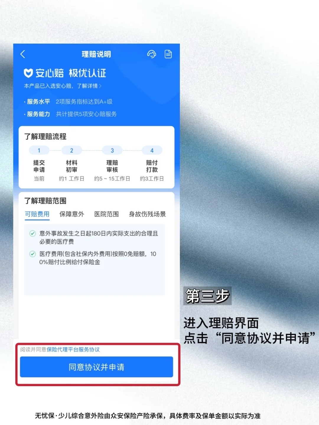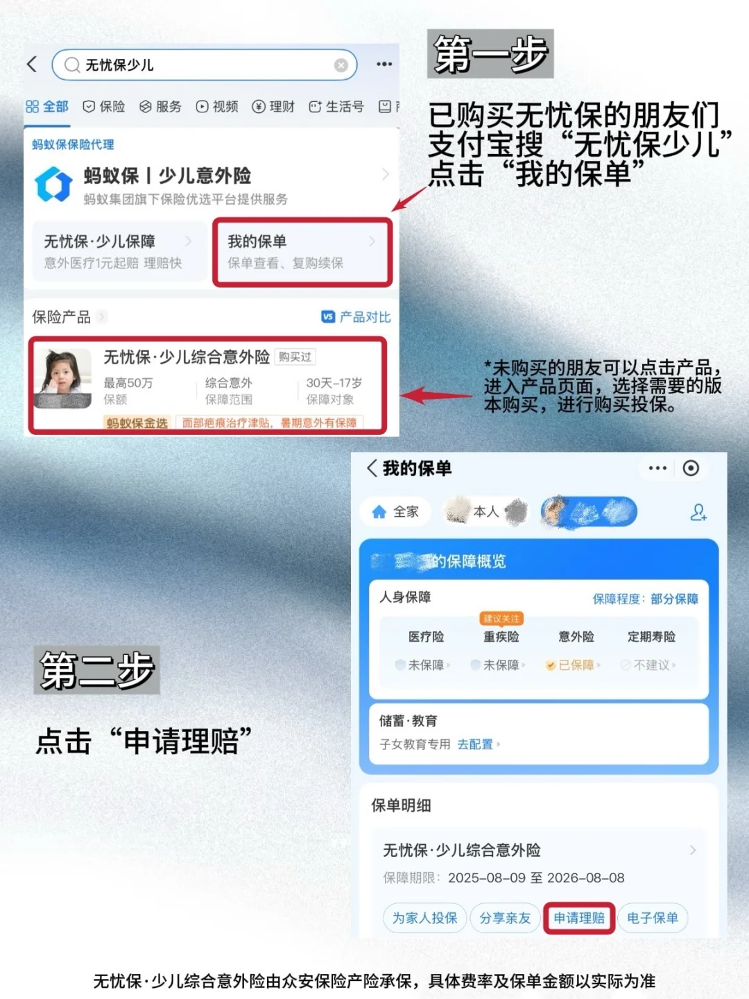 1️⃣第二天上午,我在支付宝APP里搜无忧保少儿找到我的保单,进入理赔申请页面