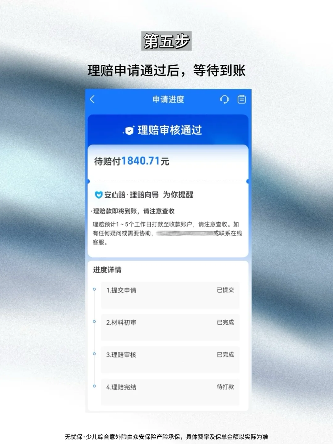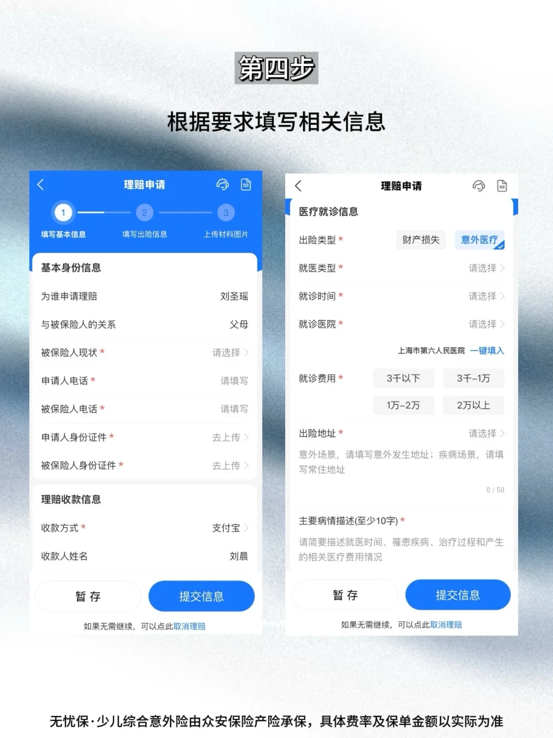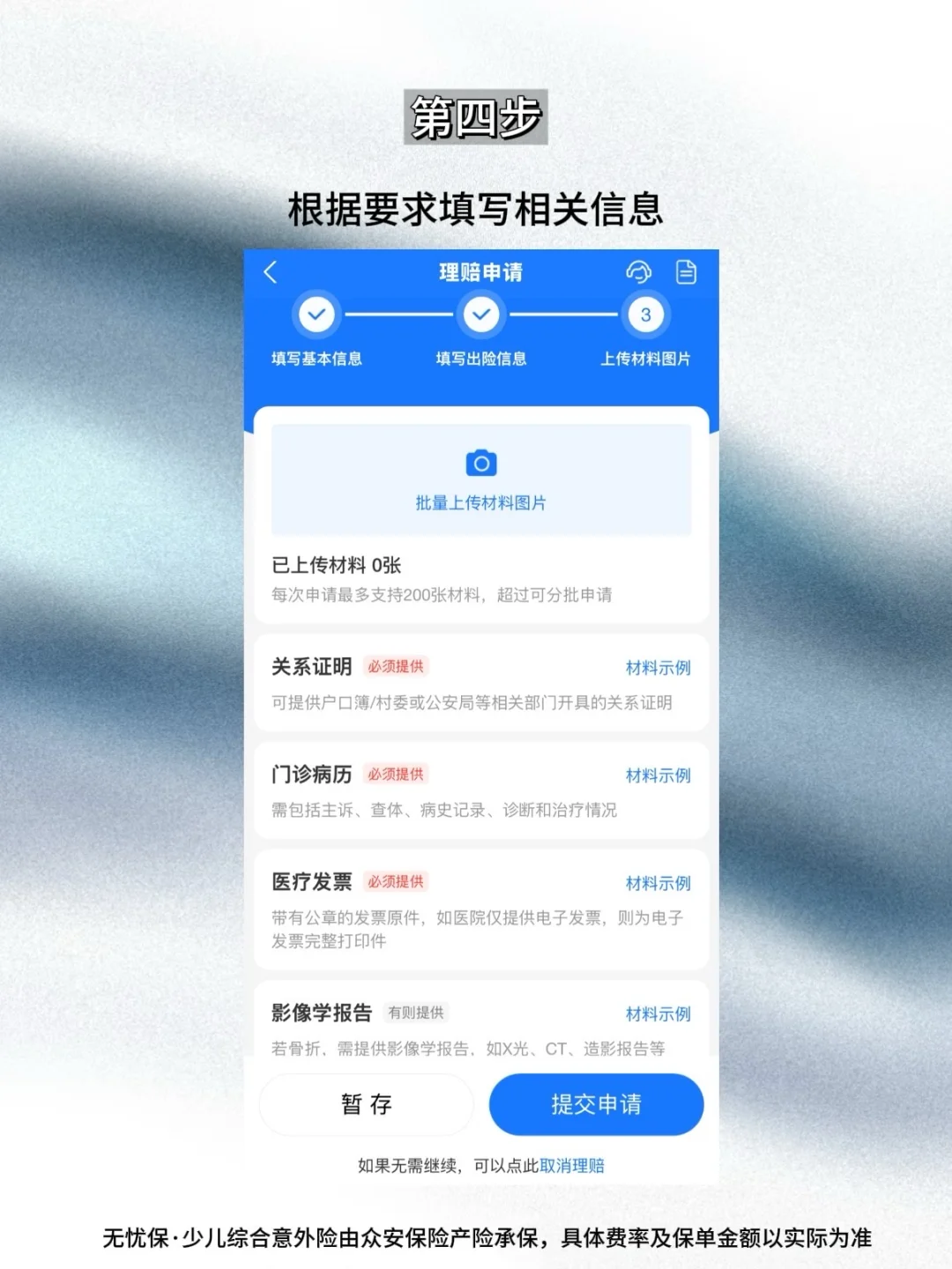 2️⃣上传材料:身份证、医疗单据照片、伤口照片、事故说明等信息(整个过程不到10分钟)