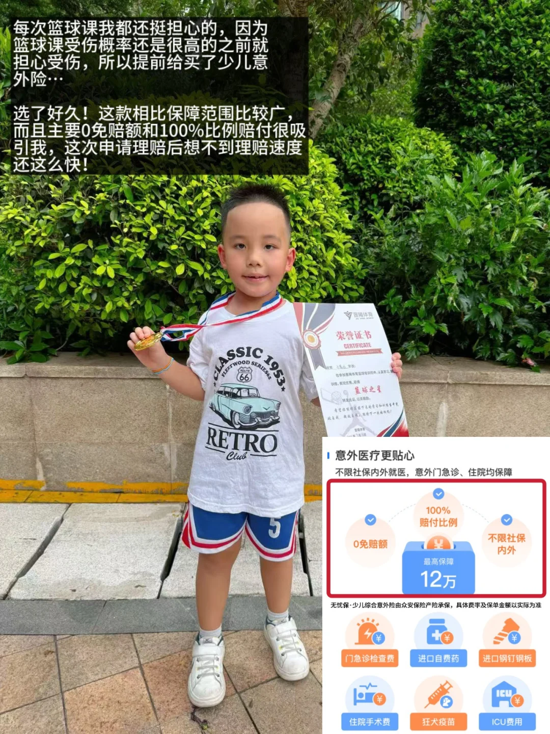 这款保险还是当初刚报篮球班的时候买的,就是怕孩子万一有个小磕小碰的,当时选了好久,最后选到了支付宝这款少儿意外险,因为里面有个加强版的保障很全面,理赔的门槛也很低,现在市面上很多少儿意外险都是有理赔门槛的,这个真的是少见的0免赔额和100%比例报销,这次真遇到了,没想到理赔速度还这么快‼️