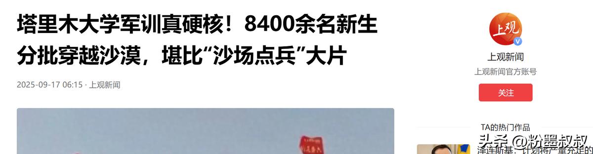 太硬核了!”新疆塔里木,塔里木大学的新生军训彻底打破认知,不站军姿不踢正步,直接把8400名新生拉进塔克拉玛干沙漠,3小时里顶着烈日走12公里,还练了匍匐前进、沙漠拉烟这些实战课,这波操作不光火上人民日报,连老外都直呼“震撼”! 咱印象里的大学新生军训,不就是站站军姿、踢踢正步,顶多再练个队列、喊几句口号吗?可新疆塔里木大学的新生军训,直接把大家的认知给打破了,今年开学他们不搞这些常规操作,居然把 8400 名新生拉进了塔克拉玛干沙漠,这可不是闹着玩的,光听着就觉得够 “狠” 的。 这军训分了 10 天分批进行,每批差不多 680 人,核心任务就一个,在沙漠里徒步走完 12 公里,还得顶着正午的烈日,3 个小时里连轴转。 你想想塔克拉玛干那地方,沙子晒得能有 40 摄氏度,光脚踩上去都烫得跳,更别说穿着鞋走了,沙子灌进鞋里,磨得脚踝生疼,有的同学走一会儿袜子就磨破了,头顶的太阳烤得人头晕皮肤晒得发红,不少人防晒霜涂了一层又一层,还是挡不住那股热浪。 而且这还不算完,路上还得练实战项目,匍匐前进的时候,胳膊肘蹭着滚烫的沙子,一下就火辣辣的,模拟敌袭紧急卧倒,动作慢一点沙子就往衣领里灌,浑身都硌得慌,还有沙漠拉烟这些课,以前只在电视里见过,现在自己亲手操作,又紧张又带劲。 好多新生都是第一次进沙漠,刚到的时候看着无边无际的沙子,心里都发怵,尤其是女生,有个 17 岁的小姑娘刚开始还偷偷抹眼泪,说实在走不动了,可看着身边同学都在咬牙坚持,再听教官讲以前的故事又硬着头皮跟上了。 教官路上会跟他们说70 多年前,1803 名解放军官兵就是从这片沙漠穿过去解放和田的,那时候条件比现在苦多了,没水喝就喝骆驼尿,没东西吃就啃树皮,硬是在 “死亡之海” 里闯出了一条路。 现在学生们走的,就是当年先辈们踏过的路,脚下的沙子、头顶的太阳,跟当年比起来算不得什么,好多学生听着听着,就忘了累了,原来自己走的不只是一段沙漠路,还是在跟着历史的脚印走,课本里的文字突然就变成了脚下的真实触感,那种感觉特别不一样。 塔大一直说要 “用胡杨精神育人”,这次沙漠军训算是把这话落到实处了,胡杨不是 “生而千年不死,死而千年不倒” 吗?学生们在沙漠里也拿出了这股劲,男生看见女生背包沉,主动接过来扛在自己肩上。 有人走得慢前面的人就停下来拉一把,队伍里时不时响起 “加油”“再坚持一下” 的声音,跟胡杨林抱团抵抗风沙的样子一模一样,以前大家都是独生子女,在家没吃过什么苦,可在沙漠里没人喊娇气,都想着怎么一起走完这段路。 这事儿一传开不光火上了人民日报,连老外都觉得震撼,说 “从没见过这么硬核的大学军训”,当然也有人质疑,说这是不是形式主义,折腾学生玩?可实际上,10 天下来,没有一个学生中途退出,每个人都咬着牙走完了全程。 结束的时候好多学生虽然累得瘫在沙子上,却笑着说 “值了”,以前觉得 “服务南疆”“建设边疆” 这些话离自己很远,现在走了一趟沙漠,才明白这所 1948 年由王震将军倡导建立的大学,为啥一直把这些当校训。 其实塔大搞沙漠军训,根本不是为了 “博眼球”,他们就是想让新生们走出教室,在真实的环境里感受点不一样的东西,不是光靠书本学历史,而是用脚去丈量,不是光靠口号学精神,而是用汗水去体会,当学生们拖着满是沙子的鞋,晒得黝黑的脸,说出 “现在才懂什么是坚持” 的时候,就知道这堂课没白上。 (信息来源:上观新闻——塔里木大学军训真硬核!8400余名新生分批穿越沙漠,堪比“沙场点兵”大片)