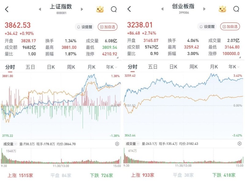 至收盘,上证综指涨0.9%,报3862.53点;科创50指数涨1.35%,报1470.41点;深证成指涨2.05%,报13479.43点;创业板指涨2.74%,报3238.01点。