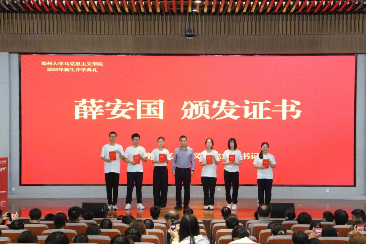 6位新生代表从马克思主义学院党委书记薛安国手中接过荣誉证书,他们表示“作为马克思主义学院的新生力量,我们定将不负时代,不负韶华,不负期望。我们将以梦为马,以笔为剑,在这片思想的沃土上深耕不辍,努力成长为一名合格的、乃至卓越的马克思主义理论人才,为实现中华民族的伟大复兴贡献我们的青春、智慧和力量。”