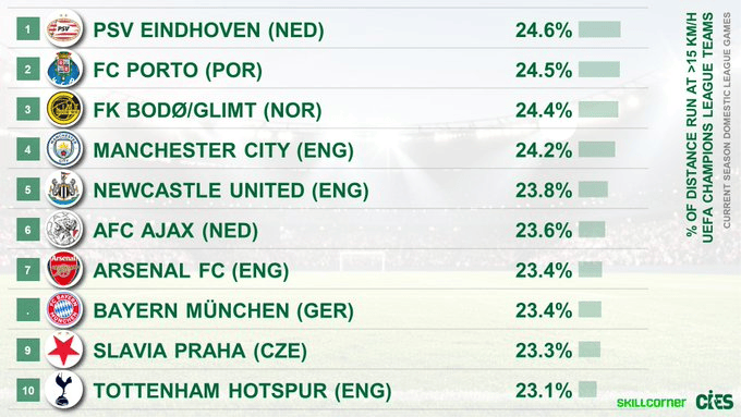 欧冠球队高强度跑动比例排名:PSV第1,曼城第4,纽卡第5