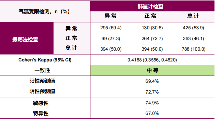 该研究的主要终点为总人群中BD试验前振荡法检查与肺量计检查结果的一致性;关键次要终点为慢阻肺病组中BD试验后振荡法检查与肺量计检查结果的一致性。研究终点使用全分析集(FAS)进行评估,包括所有同时完成两种检查的患者;同时采用Cohen'sKappa系数对一致性进行评估,其判断标准见图2[1]: