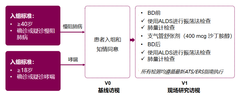 首先于基线访视(V0)时收集入组患者的人口统计学和临床信息,在现场研究访视(V1)时,患者首先使用移动肺诊断系统(ALDS)完成振荡法检查,随后进行肺量计检查,上述操作均在支气管舒张剂(BD)试验前后分别进行(研究流程见图1)[1]。