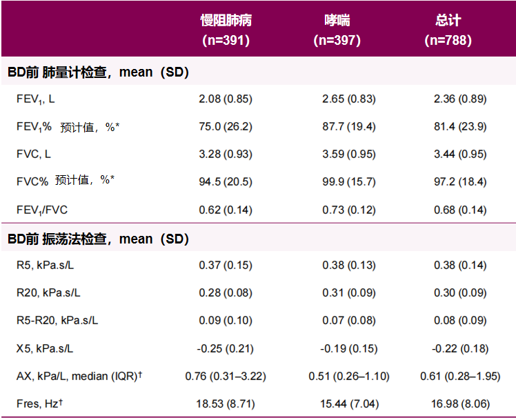 共有788例(98.4%)患者完成了振荡法检查和肺量计检查并被纳入FAS,患者基线特征如表1所示[1]: