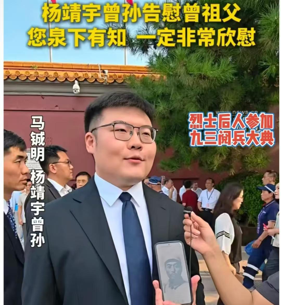 烈士的后裔获邀参与九三阅兵大典。杨靖宇的曾孙马铖明在此时深情告慰曾祖父,“如今咱