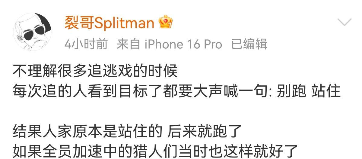 苏醒吐槽追逃戏 追的人总要先大喊一句“别跑!站住!”,本来人是站住的,听到就跑了 苏醒:要是全员加速中的猎人也这样就好了…… 哈哈哈哈哈哈哈苏醒被猎人支配的恐惧还在呢