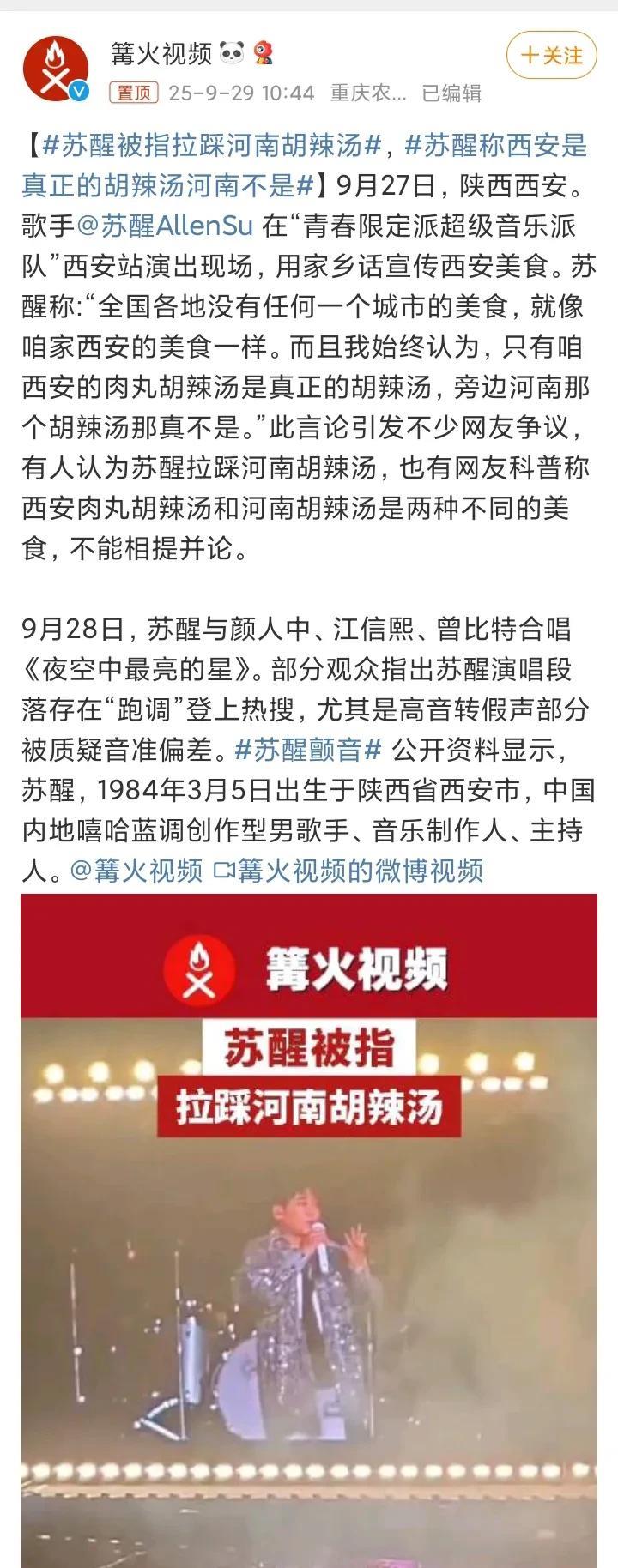 苏醒,终究还是暴露了本性。 9月29日,他在家乡西安演出时的一句话引起轩然大波,尤其是引起河南网友的反感,他说,“只有西安的胡辣汤才是真正的胡辣汤,旁边河南那个胡辣汤真不是。” 他作为公众人物,居然当众拉踩,明目张胆的挑起地域对立,而且至今没有表现出任何悔意,这显然不是“无心之失”、“心直口快”一类的词汇能解释得了的。 公众人物理应以身作则维护公序良俗,而苏醒这样的表现,很显然担不起“公众人物”的责任,不过他可能说的也有点道理,毕竟他从小喝的是陕西糊辣汤,不知道河南才是胡辣汤的发源地,所以他只知道糊。