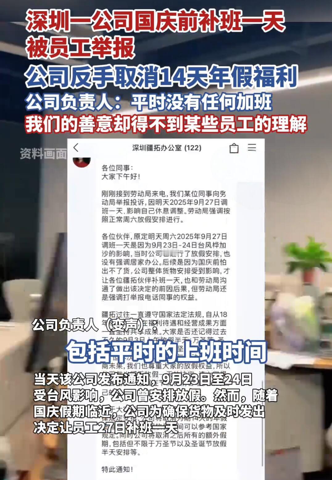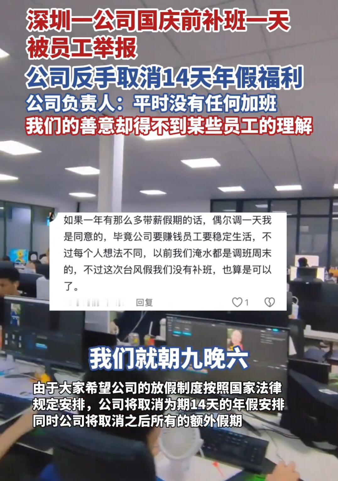 深圳有家公司,因为台风停工,让员工周六补一天班,结果被举报了。 公司气不过,直接宣布取消员工的14天超长带薪年假和所有额外福利,只保留法定的。 这事儿在网上吵翻了天。 支持公司的人说: 这么好的福利已经很难得了,员工应该体谅一下,别动不动就举报。 支持员工的人说: 补班不合法,举报是正当维权。 从法律角度看: 台风停工属于不可抗力,公司不能强制安排补班。员工有权拒绝并投诉。 而且,那些长期稳定的额外福利,公司也不能说取消就取消,这可能涉嫌违约。 我个人的看法是: 双方都有问题。 公司这边,不该用“取消福利”来泄愤,这会伤了大多数员工的心,也显得格局小了。 员工这边,遇到问题可以先内部沟通,没必要直接“上纲上线”,把路走死。 最好的解决办法应该是: 公司提前和员工沟通,给出更灵活的方案,比如自愿补班换调休、给加班费、或者用年终奖等方式来弥补。 员工这边也体谅一下公司的紧急情况,能帮就帮。 总之,多点沟通,少点对抗,才是双赢的局面。
