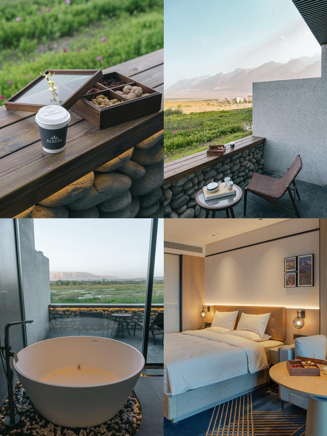 ☑️由于酒店极好的地理位置,基本就是住在风景里。我们这次订的是庭院房, 半开放式大阳台,对着草甸和雪山,大浴缸的位置也极好,泡着澡看风景。