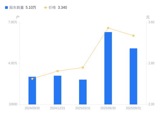 近一年(2024年9月30日至2025年8月31日),华纺股份A股股东户数从3.02万户,增加至5.1万户,增幅68.61%,区间股价上涨43.97%。