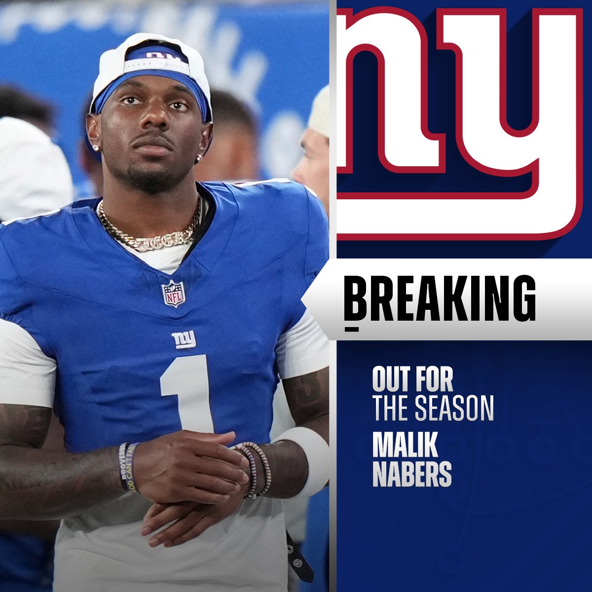 NFL官方X账号发推特报道,核磁共振检查确认巨人队外接手马利克·纳伯斯前十字韧带撕裂。(via@rapsheet)