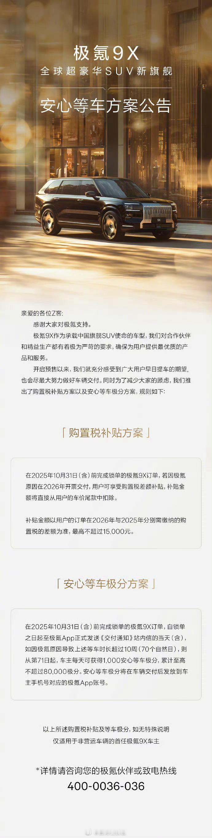 极氪 9X 官方已公布购置税补贴方案、安心等车极分方案,最高不超过 1.5 万元,直接从尾款扣除。