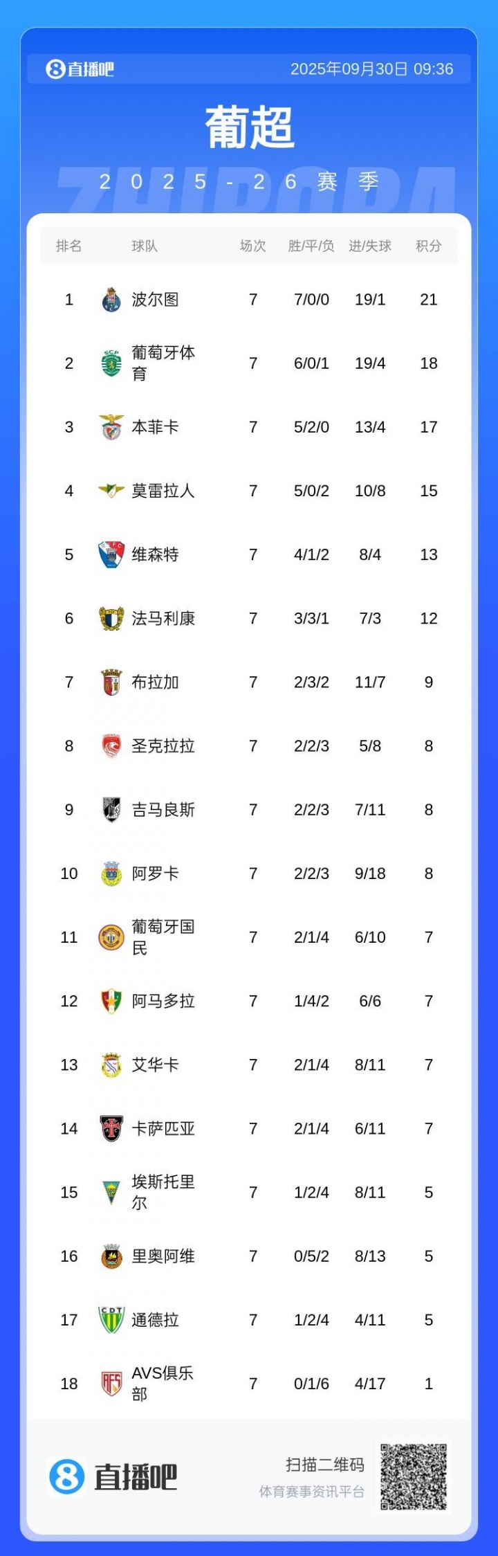目前波尔图3分领跑葡超,排第2的是葡体。波尔图的死敌本菲卡暂时4分落后,排在第3位。下一轮葡超,便正是葡萄牙国家德比:10月6日,波尔图vs本菲卡。