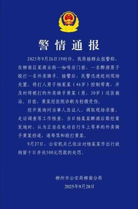 好好好,这件事处理的确实很好!9月26号的时候,柳州市发生了一件事。 一名顺丰的骑士在等单的时候,无端遭到了一名男子的殴打。 事情的起因很让人无语,一名杨姓的醉酒男子,醉醺醺的上来要求骑手把他送到某个地方。 结果骑手拒绝了他的要求,解释道自己正在工作,正在等单。 这名醉酒男子上去就打人,对顺丰的骑手无端进行殴打! 这个时候有5名穿着蓝马甲的饿了么骑手,突然出现。 义愤填膺的骑手们冲上去就把这个醉鬼给揍了一顿。 不不不,咱们不能用揍了一顿来形容,人家这叫及时的制止暴行! 没错的,就是及时的制止暴行,至于醉鬼身上的伤,那一定是自己摔的! 肯定是自己摔的! 最后接到报警的警方赶到之后将醉鬼带到了警局。 拘留10天罚款500元,这罚款有点少啊! 都已经当街殴打无辜老百姓了,怎么才罚500块啊? 嫖娼还要罚5000呢!这光天化日之下,殴打无辜老百姓,才罚500吗? 拘留10天倒是挺合适的,这个罚款实在是太少了! 但是后续顺丰公司做的却很漂亮,顺丰总部知道了这个新闻之后。 很快做出了决定,奖励5位饿了么的骑手小哥,一人5000块钱! 这叫做见义勇为奖! 漂亮,这事干的大气! 咱们这个社会就需要对这种正义的事情进行重赏! 这种新闻越来越多,才能鼓励社会正气越来越浓嘛! 我们都希望好人越来越多,那你就不应该让好人受委屈,而且也应该让好人受到奖励。 这才能凝聚社会正气! 顺丰公司一共花了25,000块,对于这么大公司来说,完全就是九牛一毛的小钱。 希望未来咱们中国的企业多一些这样的激励政策。 好人好事见义勇为的行为就应该重奖! 只有这样未来才会有更多更多的好人!