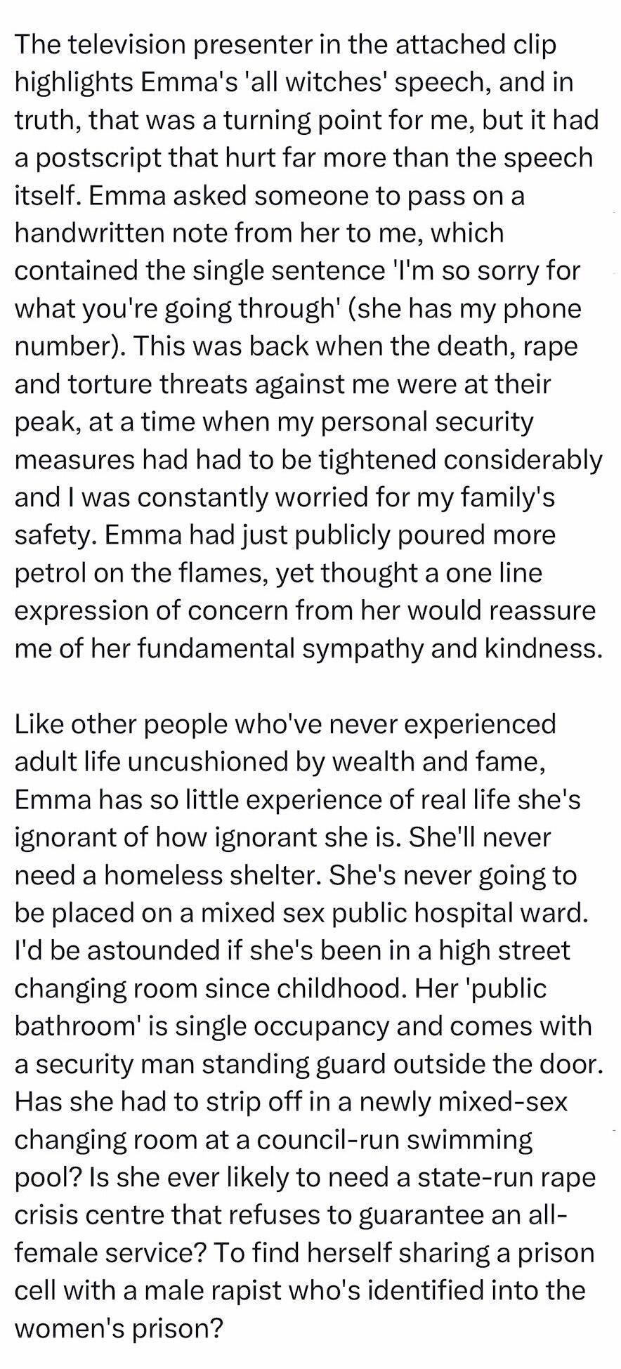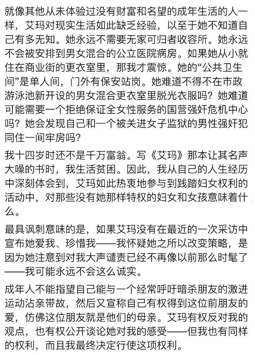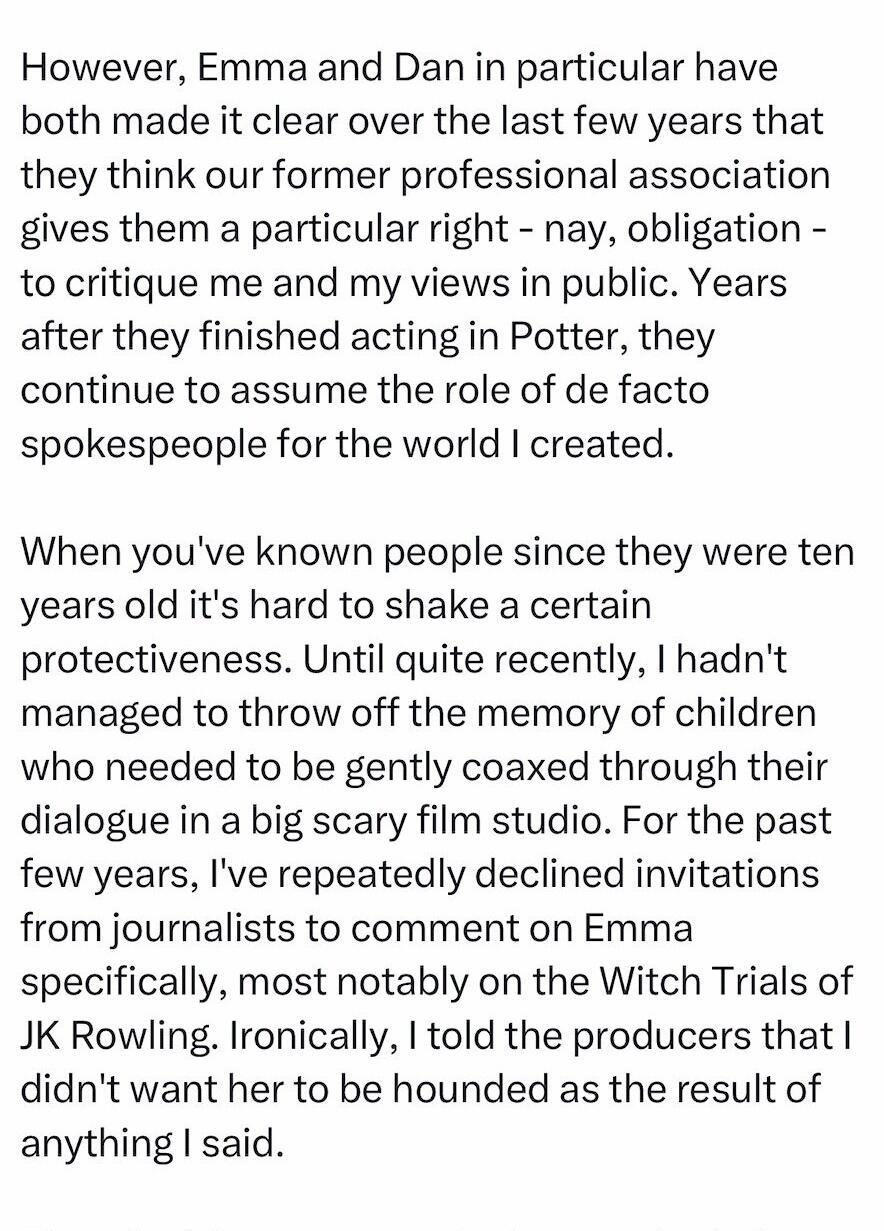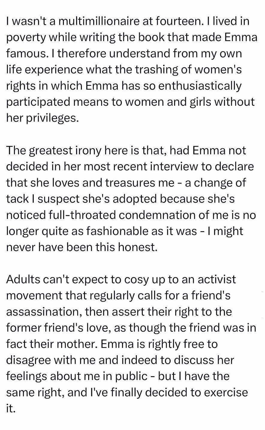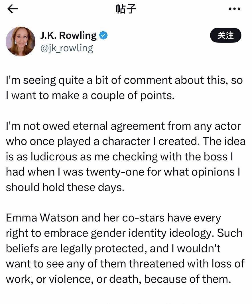 J.K.罗琳发千字长文,抨击艾玛·沃特森虚伪,表示觉得自己被艾玛背刺。罗琳说自己遭受死亡威胁时艾玛曾托人转交过一封亲笔信,她称:“艾玛在公开场合火上浇油后,竟以为这句轻飘飘的关切就能让我相信她本质上的善意”;她还说艾玛在最新访谈中突然宣称依然敬爱我,是因为她发现社会风向变了,对我的公开谴责已不再时髦。