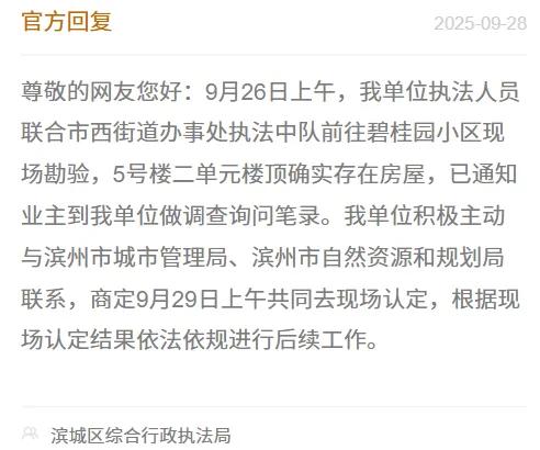 事发滨州一知名小区!楼顶违规搭建房屋?官方介入 近日,滨州一市民在民网领导留言板投诉:(图一) 官方回复:(图二)