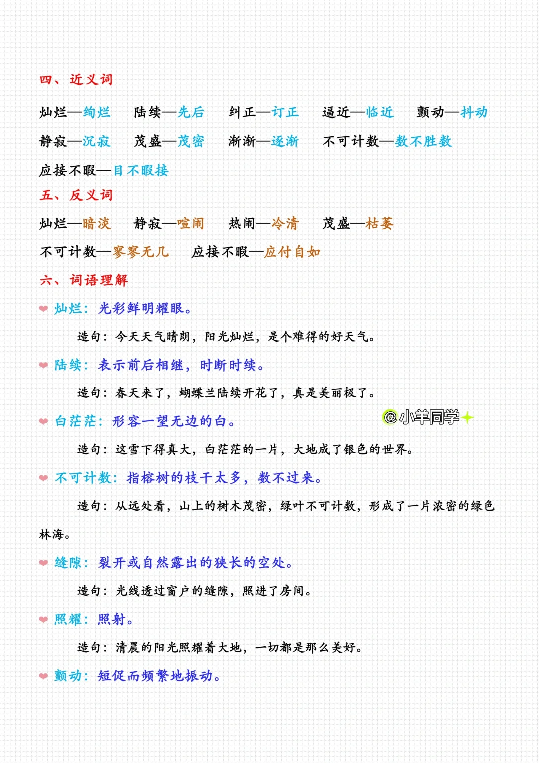 灿烂—绚烂 陆续—先后 纠正—订正 逼近—临近 颤动—抖动 静寂—沉寂 茂盛—茂密 渐渐—逐渐 不可计数—数不胜数 应接不暇—目不暇接