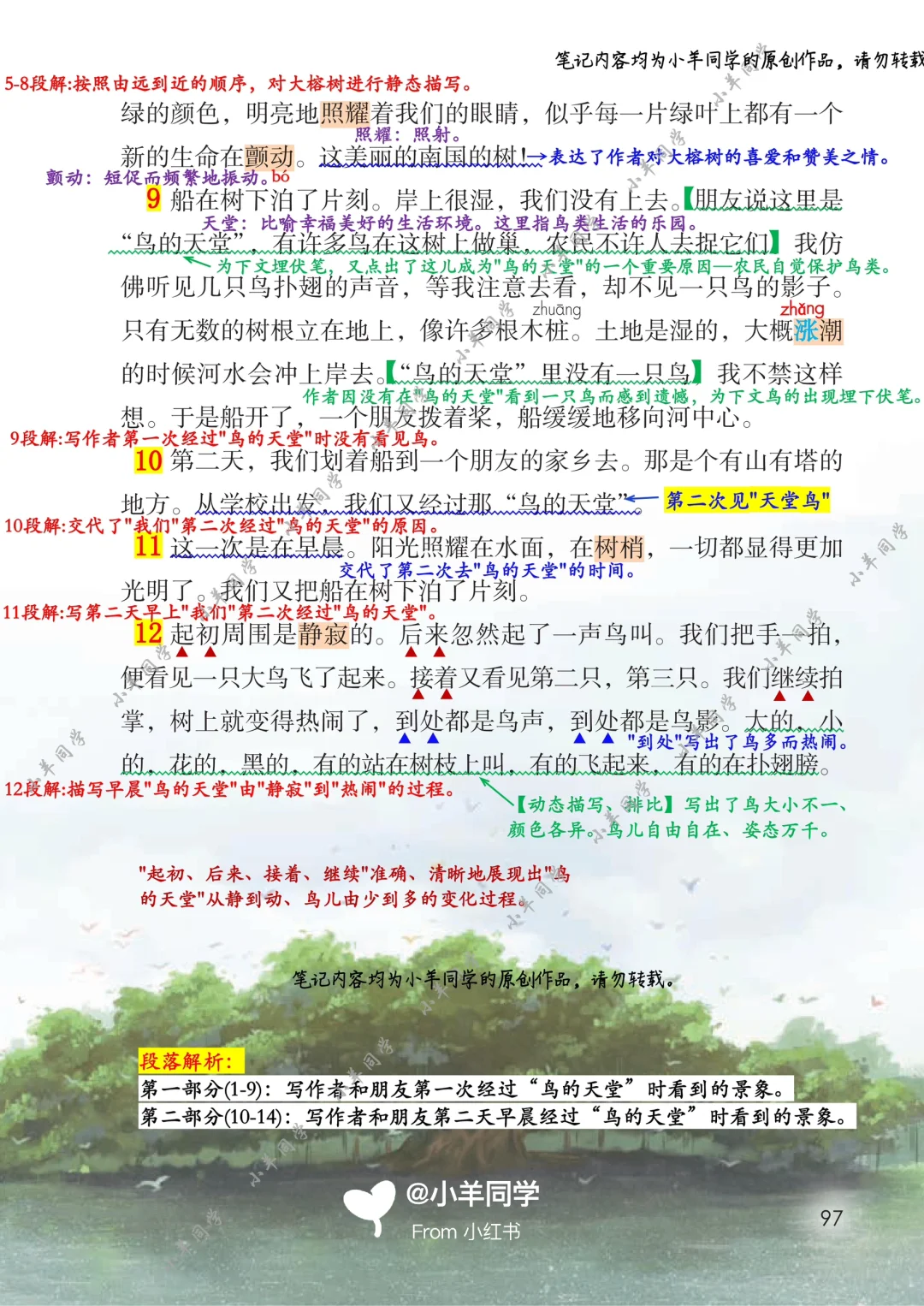第二部分(10-14):写作者和朋友第二天早晨经过“鸟的天堂”时看到的景象。