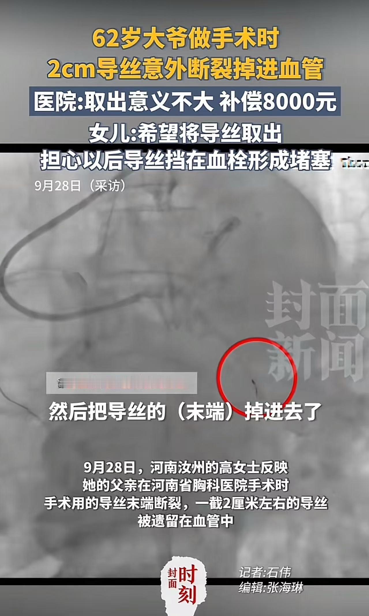 河南汝州一患者术后导丝留体内 医院补偿方案引争议 河南汝州62岁患者在河南省胸科医院做血管疏通术时,2厘米导丝断裂留血管内。患者女儿要求取出,医院会诊称取出意义不大,愿补偿8000元。高女士咨询其他医生,被告知导丝或致血管堵塞,遂求助媒体。此事引发网友热议,认为医院推诿责任。 网友评论: 我觉得医院还是不错的至少告诉家属这个事情了,他不说家属也不知道啊! “8000块补偿”和“取出意义不大”这两句话,听着就让人心里发堵。患者把最金贵的命交到医院手里,不是来“被添隐患”的——2厘米导丝在血管里,就像颗没定时的炸弹,万一随血流堵到心脏、脑部,可不是“意义不大”,是要人命的事! 医院说“老人身体不适合再手术”,可家属咨询的医生明确说“异物会引发堵塞”,这两种说法的差距,本质是“糊弄了事”和“对生命负责”的区别。别说8000块,就是8万、80万,也换不回患者和家属对医院的信任。既然是手术中出的问题,医院该做的不是甩钱推诿,而是赶紧找更专业的团队评估方案,哪怕难,也得拼尽全力把隐患去掉——这才是医院该有的担当,才对得起“救死扶伤”这四个字。 淄博有个部队医院能取,我朋友就是在哪里取的,济南三甲医院没搞定。 补牙的医疗器械也容易断在牙根里面。 还要追究导管生产厂家的责任,质量问题。