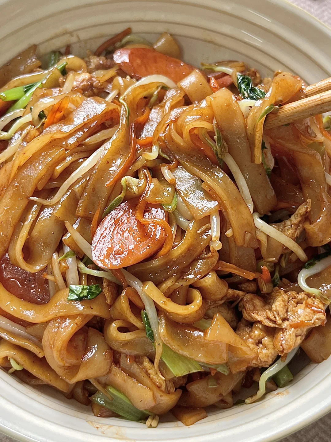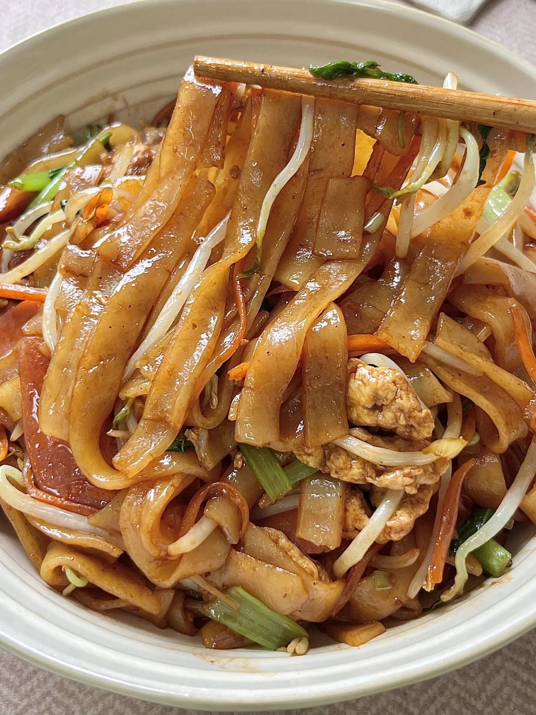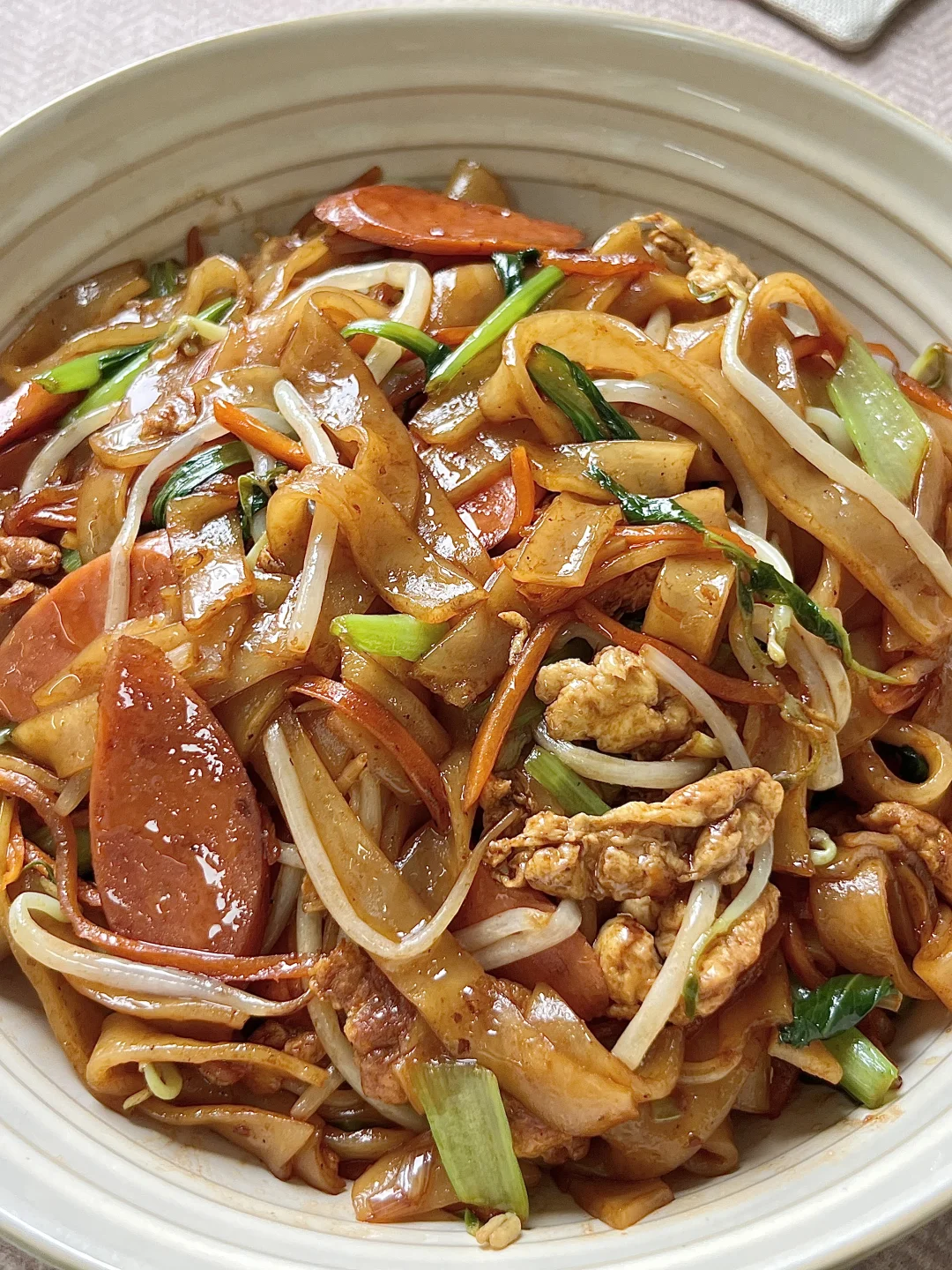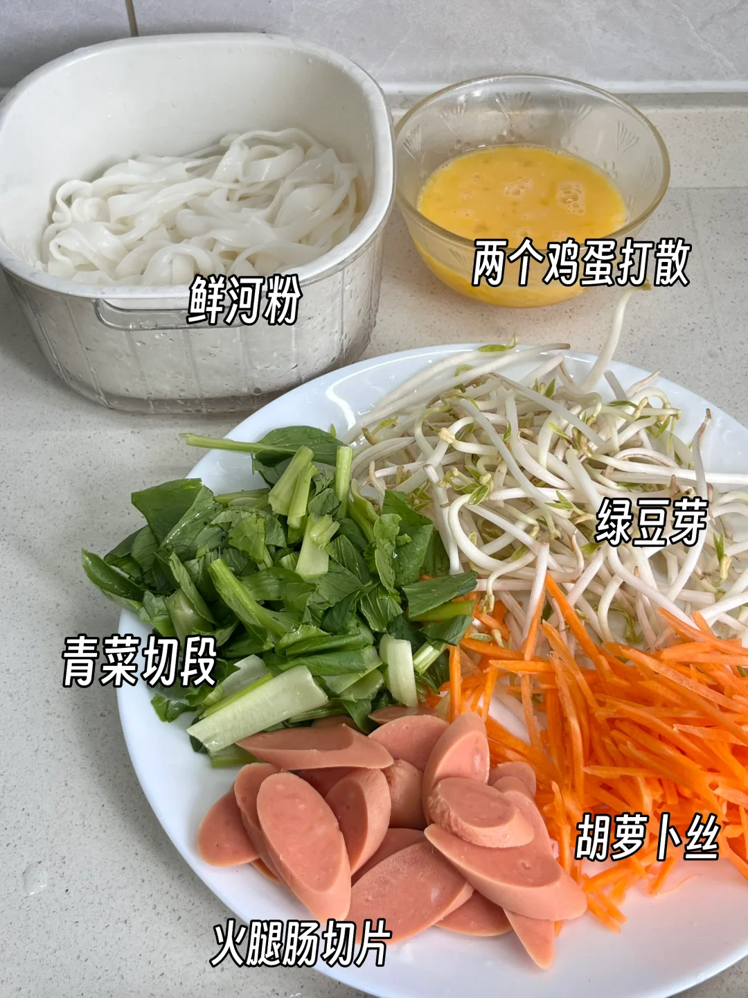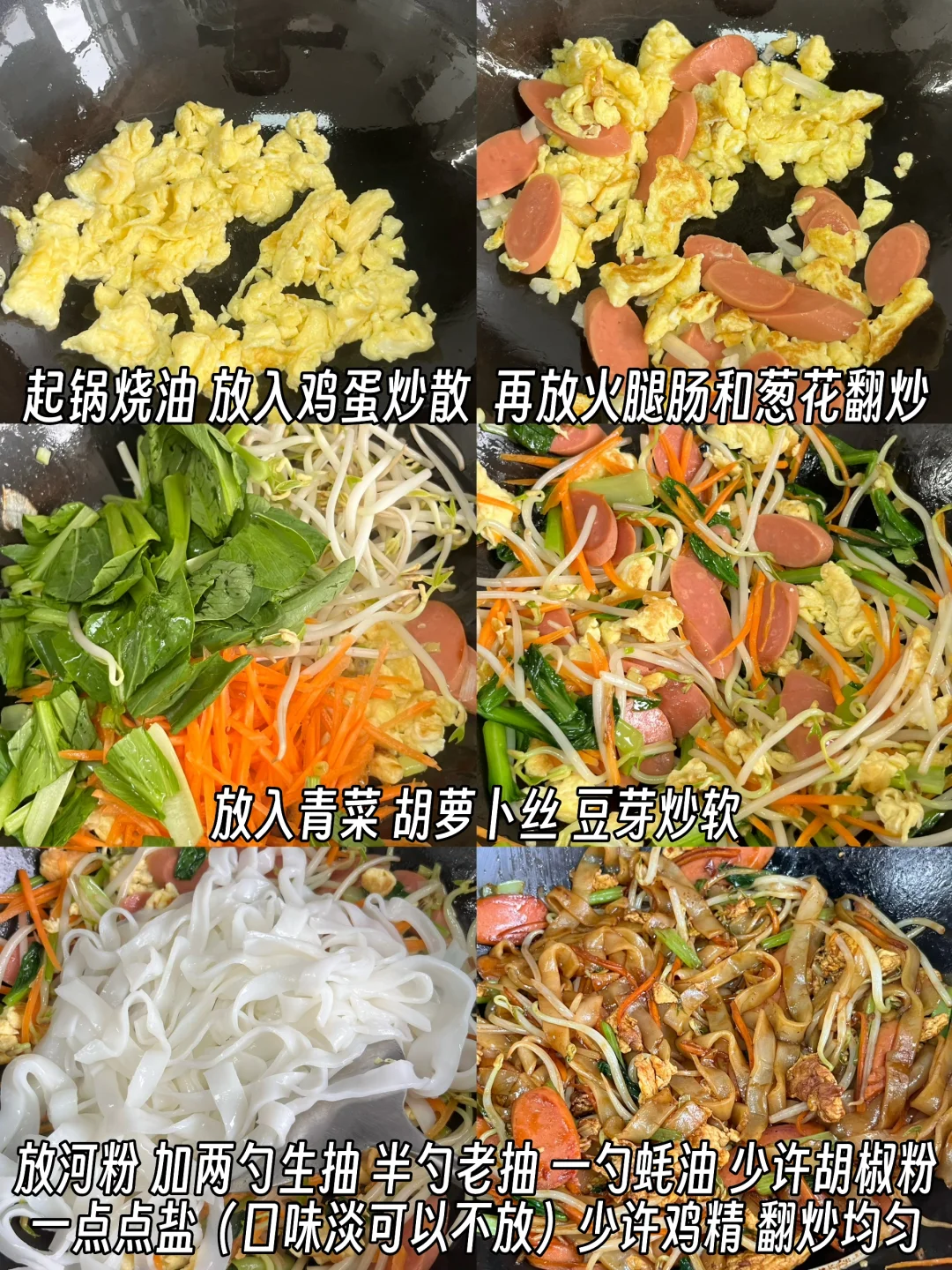 附做法: 1️⃣两个鸡蛋打散备用,起锅烧油,放入鸡蛋炒散,再放火腿肠片和葱花炒香 2️⃣放青菜段、胡萝卜丝、豆芽炒软,再放河粉,加两勺生抽、一勺蚝油、半勺老抽、一点点盐(口味淡可以不放)、少许鸡精、胡椒粉翻炒均匀✅ -