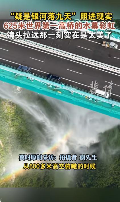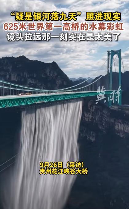 “解释不清了!”贵州,一男子准备用无人机拍摄花江峡谷大桥,结果,刚起飞就发现绝美一幕,水幕调试时,竟然在大桥下方,出现了大型彩虹,连老天爷都在为“世界第一高桥”增光添彩,飞流直下三千尺在这一刻具象化了,网友:若是李白看到,又会如何写…… 很多时候拍到最为震撼的景象往往不是提前设计的,而是在出现一瞬间的镜头里。近日在花江峡大峡谷,就发生了一幕比较奇特的景观,令人拍手叫绝。 王大哥(化名)那天想要试一下自己新买的无人机拍照情况怎么样,然而就在他还在调试角度的时候,他的目光直接就被屏幕上的景观给狠狠地吸引住了。 画面中显示桥上的工作人员正在试调水木系统,这时候直接顺着桥两侧喷洒出了很密集的水雾,原本就只是一次普通的试调工作,最后却被王大哥拍成了壮丽的景观。 然而令人更意想不到的是,阳光也正好从从侧面照过来,然后打在水雾上面,折射出了很多不同的颜色,像极了彩虹。 就这样彩虹横跨峡谷,完整明亮,甚至连平时不容易看到的紫色都十分明显。水雾和阳光在那一刻完美叠加,让自然现象和工程试验碰撞出意想不到的画面。 王大哥当时在拍的时候,直接紧张到手指发抖,一方面是因为他被眼前的彩虹震撼,另一方面也为祖国基建的实力而自豪。 等视频在网上传播后,网友们的第一反应就是想到李白的诗句,有人说,大桥喷出的水幕就像“飞流直下三千尺”,而彩虹的出现,则让这幅画面仿佛成了古诗的再现。 这种联想,其实反映了我们的文化习惯,看到极致的景象,总会用古典语言去寻找表达。 甚至还有一些网友在下面调侃,隔空喊话说:让李白出来,面对此情此景再来吟诗一首。 所以,这条彩虹的意义,远不止是一次漂亮的风景,它让我们看到物理条件的偶然,感受到自然与技术的融合,也唤起了文化上的共鸣。 虽然彩虹只存在了短短几分钟,但它已经成为一种长久的记忆,提醒我们最打动人的东西,往往出现在最不经意的瞬间。 那么,对此你还有什么看法吗? (信息来源 :冀时 2025-09-25)