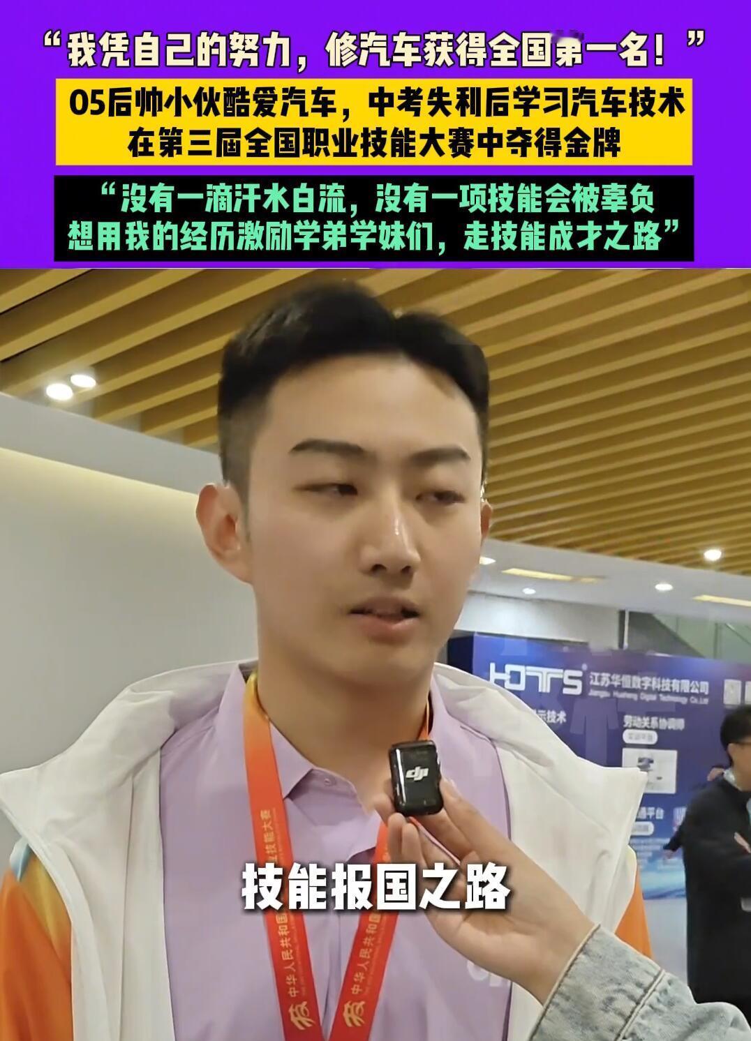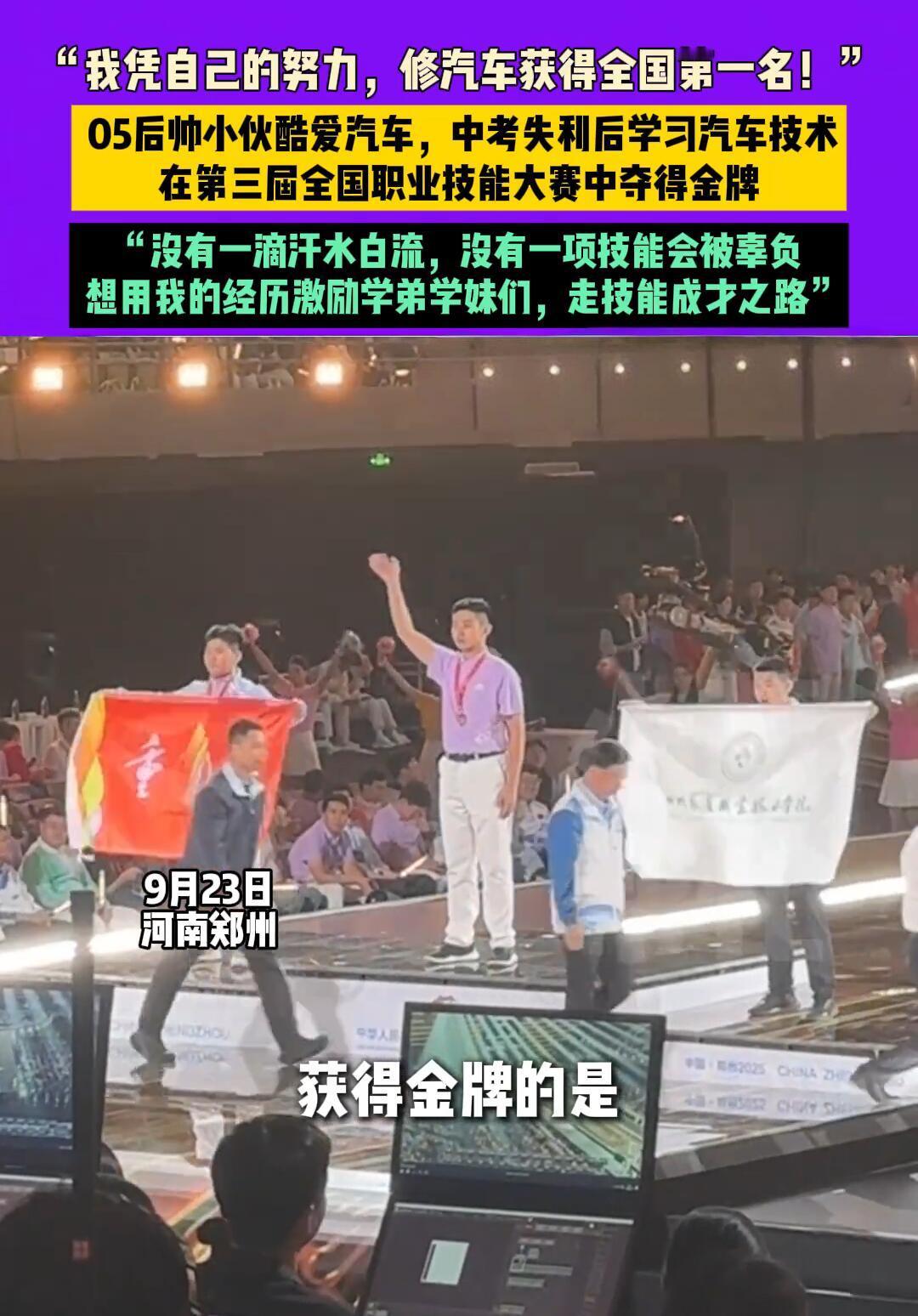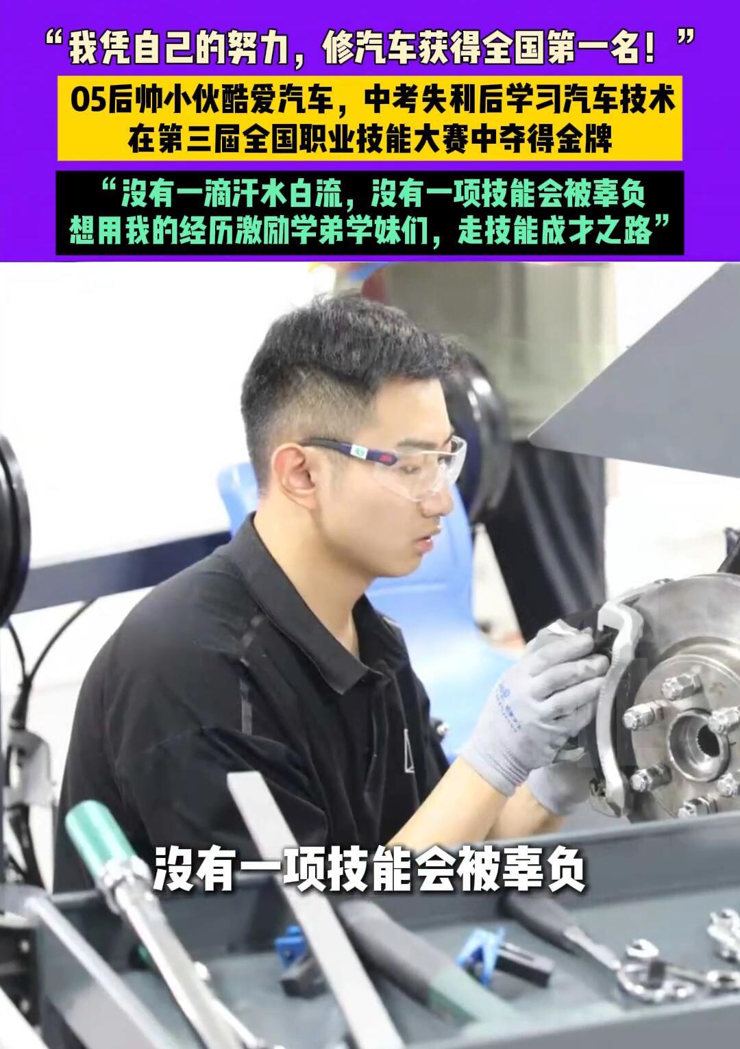 最近05后汽修冠军王盛研刷屏了!这小伙太给劲儿,中考没考好,转头死磕汽修,直接拿了全国第一,用金牌狠狠打破了“学技能没出息”的偏见。 9月23号郑州的全国职业技能大赛上,他举着汽车技术项目金牌,全场都炸了。谁能想到,这双手满是机油的冠军,以前也因为中考失利emo过?但他从小就迷汽车引擎的声音,干脆选了汽修专业,从拧第一颗螺丝开始扎进去。 备战的时候是真拼,发动机、制动系统、电动车电路,五个难模块来回啃,经常练到凌晨两三点,结束后胳膊都抬不起来,拳头都攥不紧。别人觉得汽修又脏又累,他倒觉得排查故障跟侦探破案似的,解决一个就爽一次,重复千百次的拆装都成了乐趣,最后从19个选手中硬生生冲了出来。 现在的高技能人才早不是以前那样了,22岁评特级技师、拿教授待遇和购房补贴的大有人在,刚毕业就被企业给处级待遇的也不少。技能大赛拿奖不光有钱,还能免试升学、优先找工作,成才的路宽着呢。 王盛研说想告诉学弟学妹,中考失利不算啥。这话没毛病,青春哪只有一条路?把喜欢的事练到顶尖,再平凡的坚持,早晚都能发光。技能这东西,你对它上心,它就绝对不辜负你!