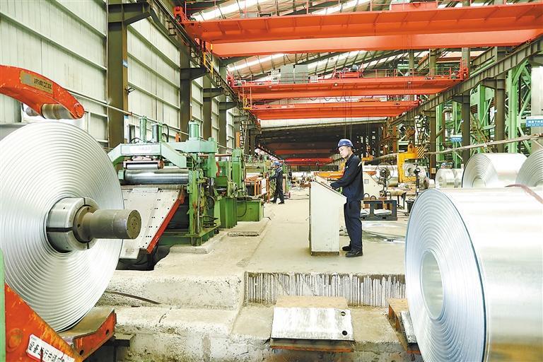 河北宝亨金属制品有限公司高档家电板材料项目生产车间,工作人员正进行成品卸卷工作。本报记者董旭旭摄