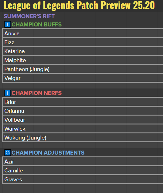 虎扑09月30日讯LOL官方发布25.20版本改动名单。25.20版本此前也确定将成为2025LOL全球总决赛比赛版本。改动名单如下: