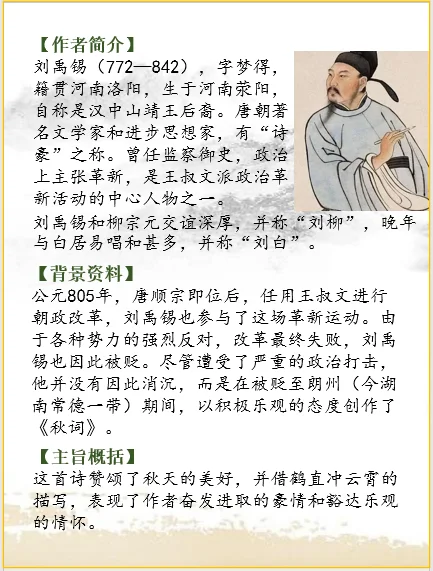 公元805年,唐顺宗即位后,任用王叔文进行朝政改革,刘禹锡也参与了这场革新运动。由于各种势力的强烈反对,改革最终失败,刘禹锡也因此被贬。尽管遭受了严重的政治打击,他并没有因此消沉,而是在被贬至朗州(今湖南常德一带)期间,以积极乐观的态度创作了《秋词》。