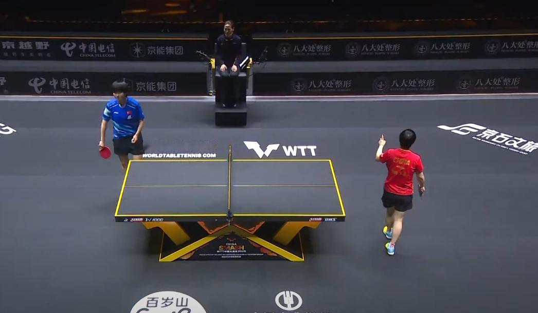 突发,这次孙颖莎主动暂停比赛, 示意她球迷, 不要干扰别人发球! 莎莎人气太高了, 一上场, 那加油声此起彼伏。 但是今天对手是 小将朱思冰。 孙颖莎粉丝还在干扰人家发球, 莎莎不满意了, 竖起小手,示意安静, 莎莎果然正能力, 希望用实力说话。