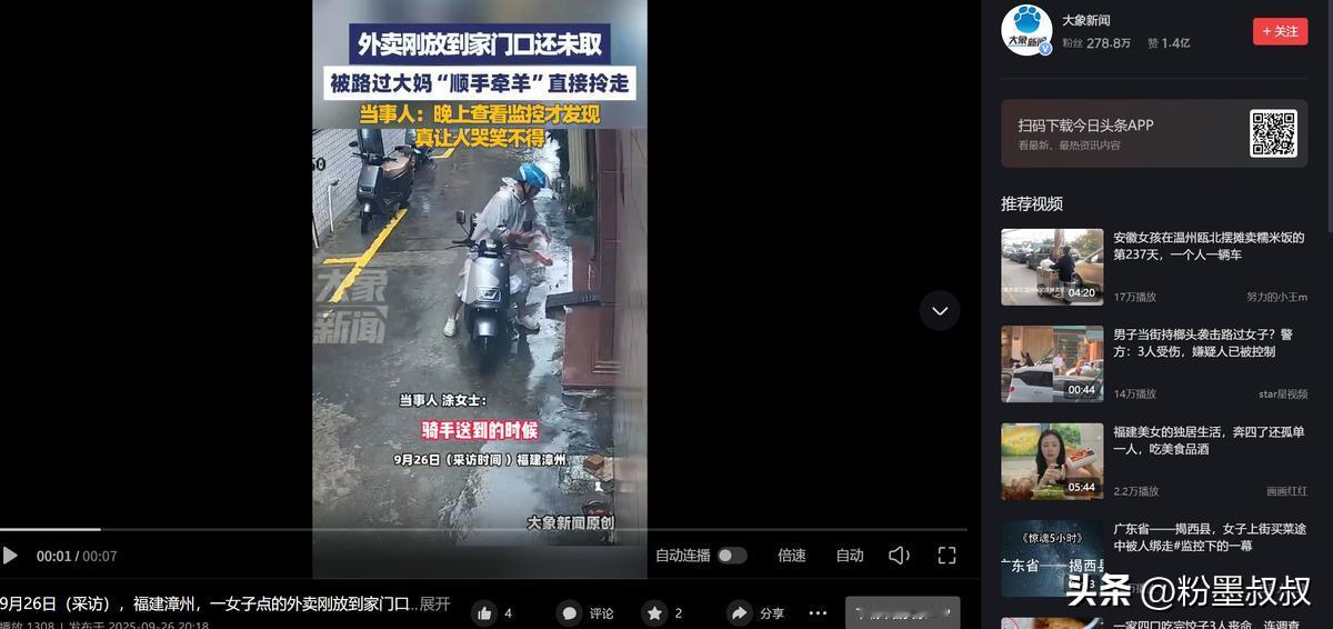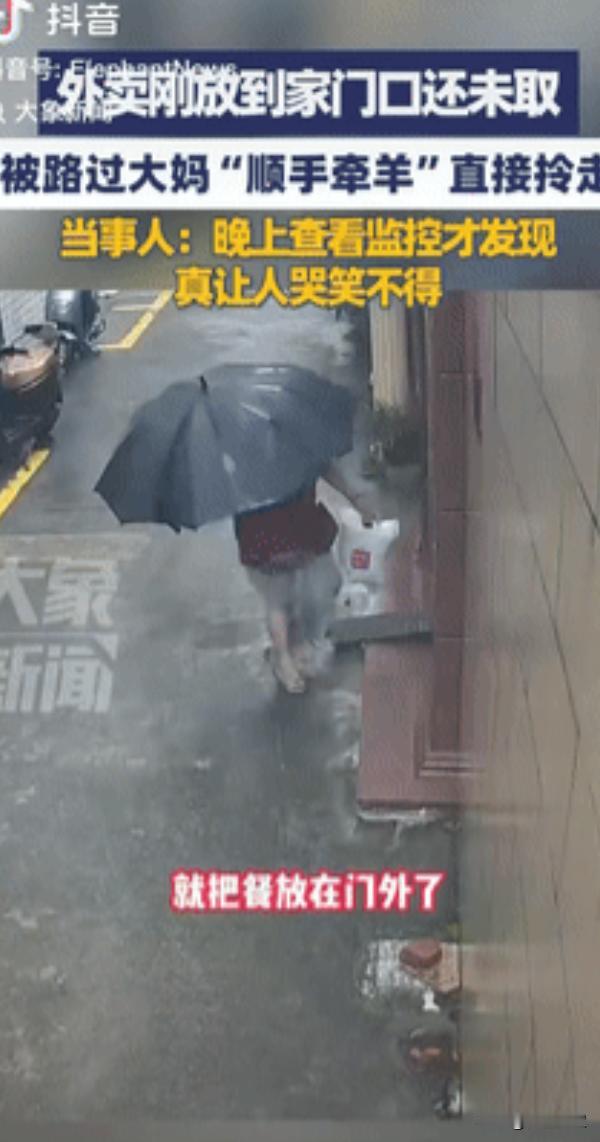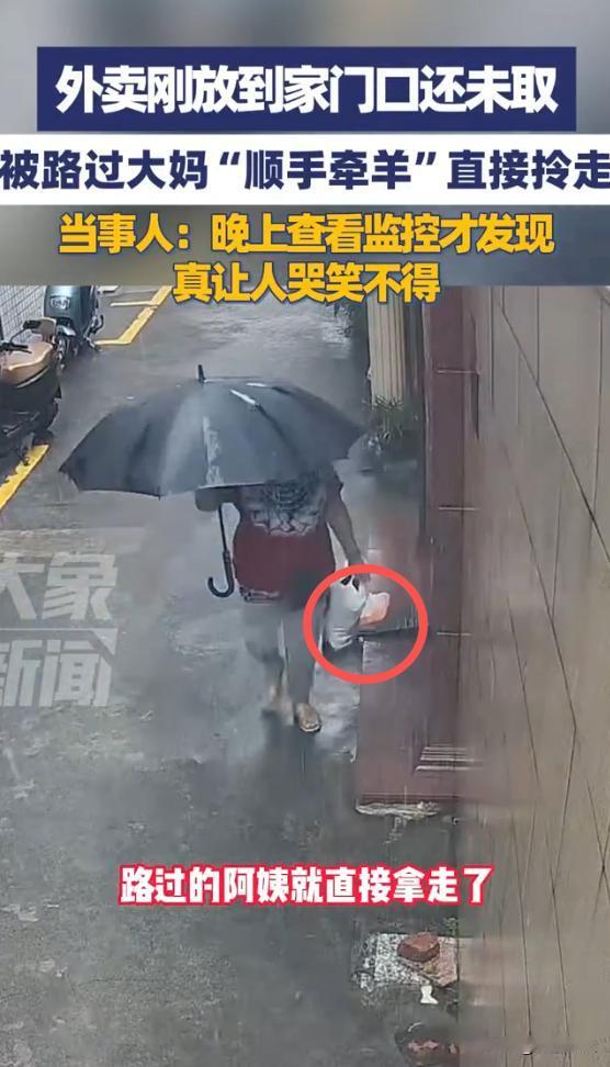 “太缺德了!”福建漳州,一女子雨天点外卖,骑手敲门没人开,于是就放在了门口,之后女子想起来出门拿外卖时,却不见了,调监控一看,竟是一名陌生大妈趁没人,揣着外卖溜之大吉,网友:这便宜占得也太掉价! 福建漳州前些天连着下大雨,那天雨下得尤其大,瓢泼似的砸在窗户上,听得人都不想出门,有个女的懒得做饭,就点了份外卖,想着等餐到了热热乎乎吃一口,能驱散点雨天的凉劲儿,可没成想,最后等来的不是餐食是一肚子气。 送这份餐的骑手小哥,那天估计也忙得脚不沾地,雨天订单本来就多,平台还催得紧超时一分钟都可能扣钱,他赶到女顾客家门口的时候,按了门铃、敲了门,可外面雨下得太吵,屋里的人压根没听见动静。 小哥看着手机里下一单的倒计时,又犹豫了几秒,最后还是把餐放在门口,转身就赶往下一家了,他大概是想着 “先放下,顾客一会儿看到提示会来拿”,可没料到这份没人看管的外卖,转眼就成了别人眼里的 “便宜”。 小哥走了没几分钟,一个穿花外套的中年大妈就出现在楼道里,她哪儿是碰巧路过啊,动作一看就是早有预谋:先站在楼道口四下扫了一圈,确定没人注意又凑到女顾客家门口,扒着门缝往里偷偷看,确认屋里没动静才敢伸手。 一把就把那份还带着余温的外卖揣进了自己怀里,脚步都没停,头也不回地就溜了,整个过程也就几十秒熟练得不行,看着就不像是第一次干这种事。 屋里的女顾客,后来看到手机上 “外卖已送达” 的提示,才想起去门口拿,结果一开门门口空空的,连个餐盒的影子都没有,她还以为是骑手送错地方了,联系小哥才知道餐早就放在门口了。 这时候她才慌了赶紧找物业调了楼道监控,一看到监控里大妈那套 “行云流水” 的偷餐操作,气得不行,下雨天点份外卖多不容易啊,怎么就有人好意思把别人的东西揣自己兜里? 不过她也没选择报警,觉得 “就一份几十块的外卖,报警还得跑前跑后,太麻烦”,她先是找平台申诉,说明情况后,平台很快给她退了款,算是挽回了损失,之后又把监控片段截下来,发到了小区的业主群里没说要找谁算账,就是想提醒邻居们“雨天外卖放门口得留神,别让有心眼的人把便宜占了。” 群里的邻居看到视频都炸了锅,有人说 “这大妈也太缺德了吧,几十块的东西也偷,至于吗?” 还有人吐槽 “这便宜占得也太掉价了,丢的可不是几块钱,是脸啊!” 其实大家都明白,这事儿不是钱多少的问题,是人品的事儿,不问自取就是偷,哪怕只是一份外卖,也不能拿 “顺手” 当借口。 之前广州就出过类似的事儿,有个大妈也是总偷拿别人放在门口的外卖次数多了,被失主们联合找了出来,最后不光得把偷外卖的钱都赔了,还因为盗窃被行政拘留了。 所以别觉得 “拿份外卖没人管”,这种侥幸心理根本靠不住,真要较起真来,该承担的责任一点都少不了,想想也挺唏嘘的,雨天里骑手为了不超时冒雨送餐,顾客为了一口热饭点外卖,结果就因为有人贪小便宜,把本该顺顺利利的事儿搅得不痛快。 平台能退款,可人与人之间的信任呢?下次骑手再遇到这种 “敲门没回应” 的情况,会不会更纠结?顾客再点外卖,会不会总担心 “餐会不会被偷”? (信息来源:大象新闻——福建漳州,一女子点的外卖刚放到家门口还未取,被路过大妈“顺手牵羊”直接拎走,当事人:“晚上查看监控的时候才发现,真让人哭笑不得”)