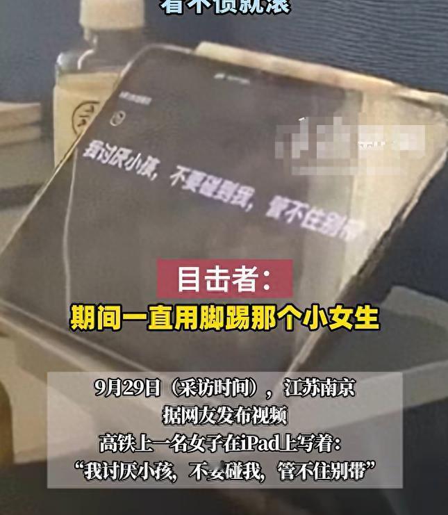 高铁上,女子因为后座男孩一直踢她的座位靠背,孩子妈妈又不管不顾,就在iPad写下几句话,提醒家长管管孩子。谁都没有想到,孩子妈妈不仅没有管教孩子,反而教孩子对着女子念脏话。两人就这么吵了起来,女子都被骂哭了。 法治视讯报道,9月29号那天,南京开往长沙的高铁上,本应该是大家安安静静待着赶路的场景,却因为一个小男孩的举动闹得不可开交。   坐在窗边的女乘客本来想着用iPad看会儿剧,打发路上的时间,可后座的小男孩不知怎么回事,一直用脚踢她的座位靠背。   一开始女乘客想着忍忍也就过去了,可没想到这一忍就是好久,小男孩的脚就没停过。   座椅被踢得一下下往后晃,女乘客连看剧的心思都没了,心里的火气也一点点攒了起来。   她实在没辙,又不想直接跟家长吵,就拿iPad写下了几句话:“我讨厌小孩,不要碰我,管不住别带”,想着这样能提醒下家长管管孩子。   哪成想家长看到这行字,不仅没觉得自家孩子打扰到别人,反而火气更大了。   她拿起手机,直接打出“最讨厌没有素质的人,看不惯就滚”,写完还不算,竟然让身边的小男孩大声念出这句话。   女乘客一听就急了,自己忍了半天没发作,到头来还被倒打一耙,忍不住跟家长吵了起来。   吵着吵着,女乘客越想越委屈,眼泪都掉了下来。   周围乘客看着也挺无奈,最后还是乘务员过来协调,给女乘客换了个座位,这事才算暂时平息。   这事说大不大,说小也不小,但里面藏着的问题却挺让人不舒服的。   孩子妈妈说“最讨厌没有素质的人”,可到底谁没素质啊?   女乘客被踢座忍了那么久,最后只是用文字提醒,没跟孩子发脾气,也没主动找家长吵架,怎么就成了“没素质”。   反倒是孩子的家长,看着孩子一直打扰别人不管不顾,被提醒了不仅不道歉,还反过来骂街,这不就是明摆着恶人先告状吗?   更让人没法接受的是那句“看不惯就滚”。   高铁是公共交通工具,不是谁家的私人空间,凭什么因为别人对孩子的不当行为有意见,就要让人家“滚”?   这种蛮横无理的态度,简直是把公共场合当成了自己家,想怎么来就怎么来。   要是每个人都这样,遇到事不反思自己,反而用脏话赶别人,那公共空间还怎么待?   更让人揪心的还是家长让孩子念那句话的举动。   家庭教育讲究的是言传身教,家长本来应该教孩子懂礼貌、守规矩,知道打扰别人是不对的。   可这位家长倒好,不仅自己用脏话攻击别人,还拉着孩子一起,让孩子跟着念那些不尊重人的话。   这哪里是家庭教育差的问题啊,这根本就是家长自己成了坏榜样。   孩子就像一张白纸,家长的一举一动都会印在纸上,现在教孩子用脏话对待别人,以后孩子会不会觉得这样做是对的?   会不会也学着用蛮横的态度处理问题?想想都觉得后怕。   不管是在高铁上,还是在其他公共场合,大家都得守点规矩,别让自己的行为影响到别人。但比起空泛地说文明,更该说说那些破坏文明还不自知的人。   就像这位家长,要是她能早点管管孩子,别让孩子一直踢座位,或者被提醒后能说句软话,也不至于闹到这个地步。   说到底,这事里最让人不舒服的,就是家长那种“我没错,错的都是别人”的态度,还有把孩子当成“帮凶”一起攻击别人的做法。   家庭教育不是说说而已,更不是教孩子怎么跟人吵架、怎么用脏话怼人。   作为家长,首先得自己做好榜样,知道什么是对什么是错,知道在公共场合该怎么约束自己和孩子的行为。不然,不仅丢了自己的脸,还会把孩子带偏,这才是最得不偿失的事。