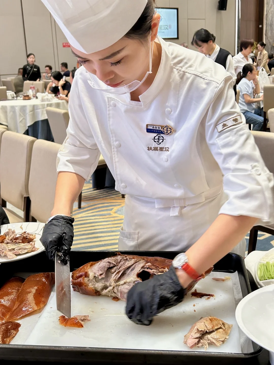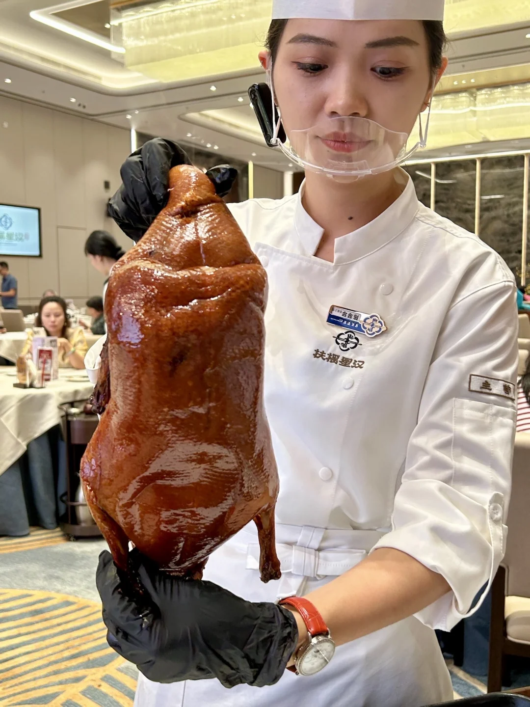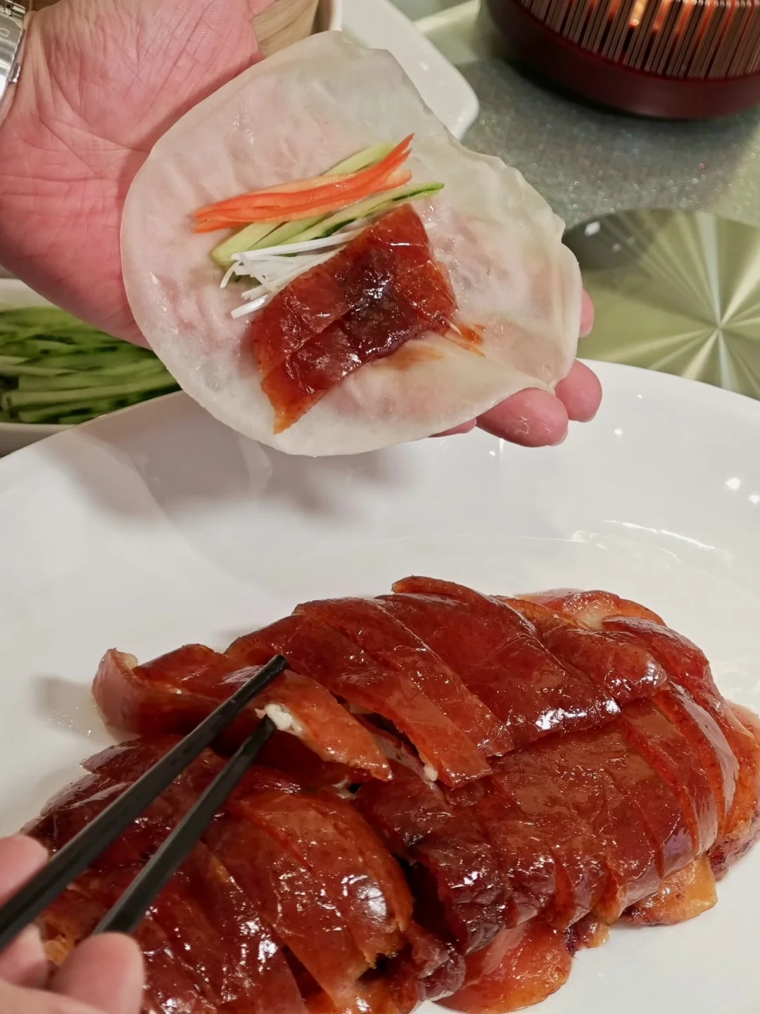 片皮鸭现点现做,果木炭烤得皮脆肉嫩,美女师傅现场片鸭超有仪式感,荷叶饼一卷,香迷糊了!吃完鸭肉还有椒盐味的鸭架你敢信,味道绝绝子啊~