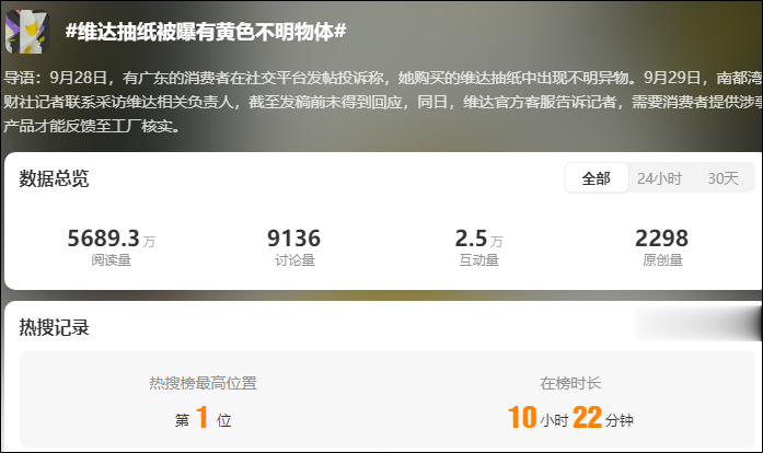 据报道,9月28日,有广东的消费者发帖投诉称,她购买的维达抽纸中出现不明异物。该消费者发布的视频显示,她从一包维达抽纸中抽出纸巾,纸巾与纸巾之间粘着黄色、疑似纸片的物体,该异物表面还有黑色污渍。9月28日,媒体联系该消费者咨询涉事产品批次号、购买渠道等信息,次日该消费者表示,她已经与品牌方进行沟通,品牌方在积极处理此事,并未透露更多信息。