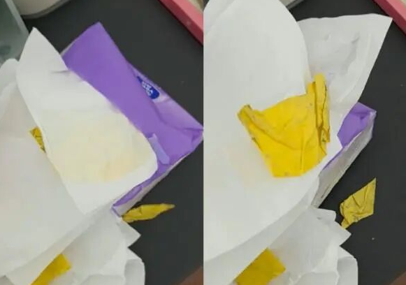 抽纸中的黄色不明物体到底为何物?对人体有无危害?该客服人员均未正面回应。