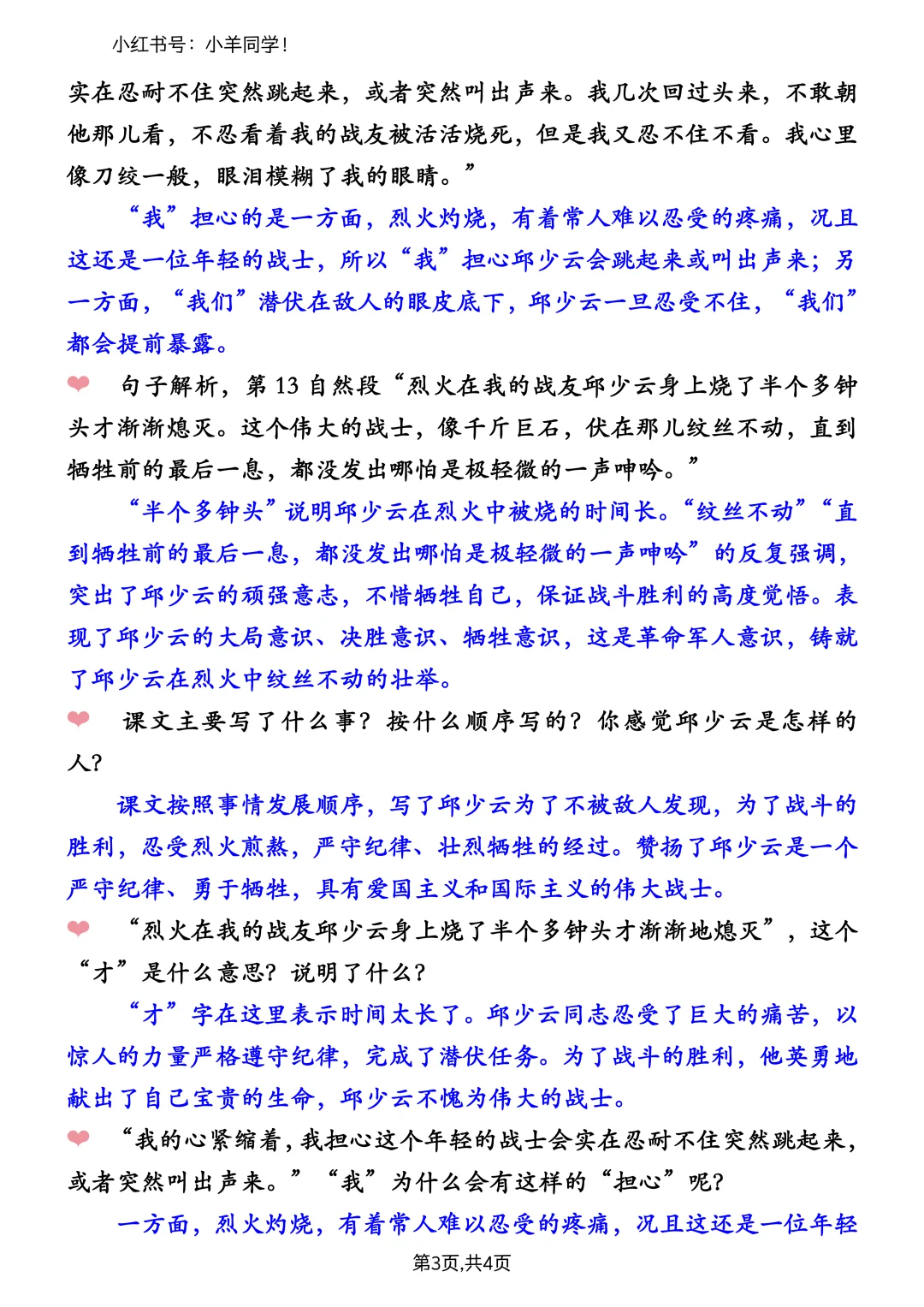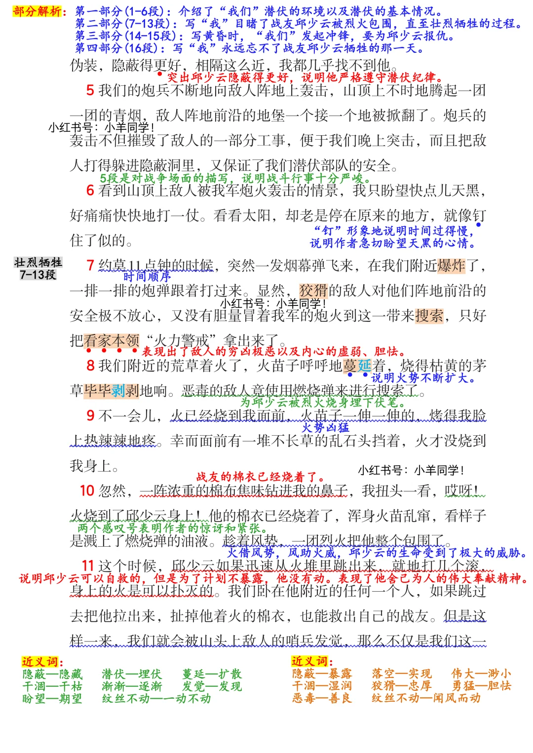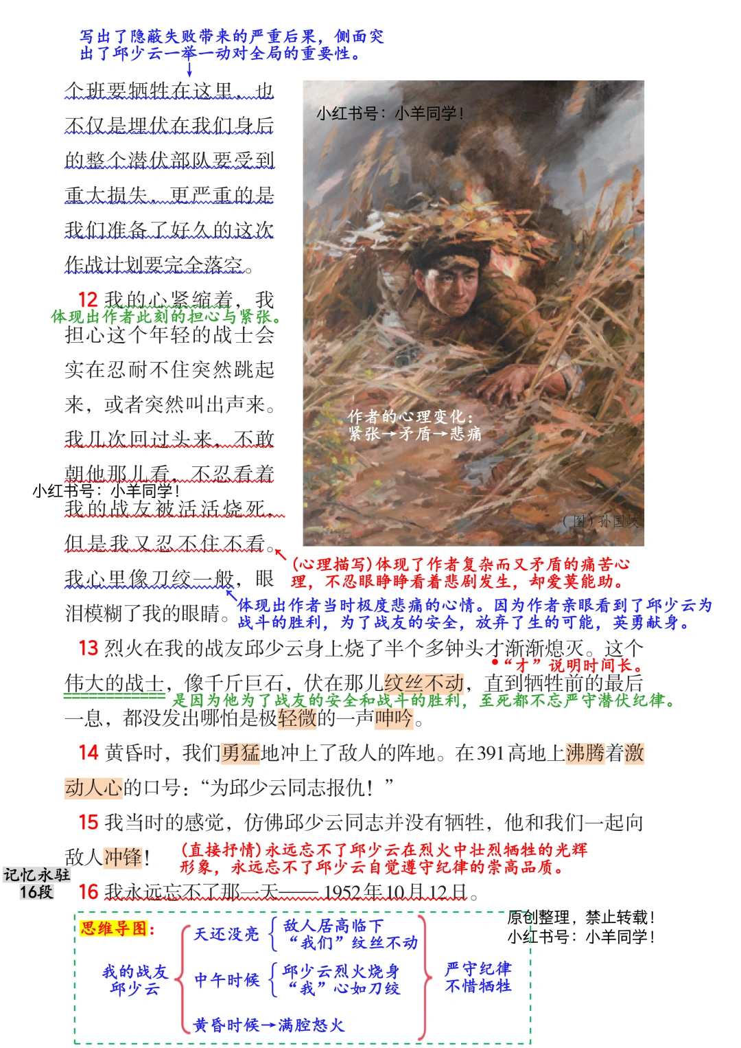学习目标: 1.默读课文,找出描写“我”心理活动的句子,体会邱少云是怎样一位“伟大的战士”。(重点) 2.理解课文,体会作者的思想感情,学习邱少云自觉遵守纪律的高尚品质和英勇献身的伟大精神。 3.能领悟志愿军战士潜伏的山沟环境与邱少云任凭烈火烧身纹丝不动的联系。(难点)