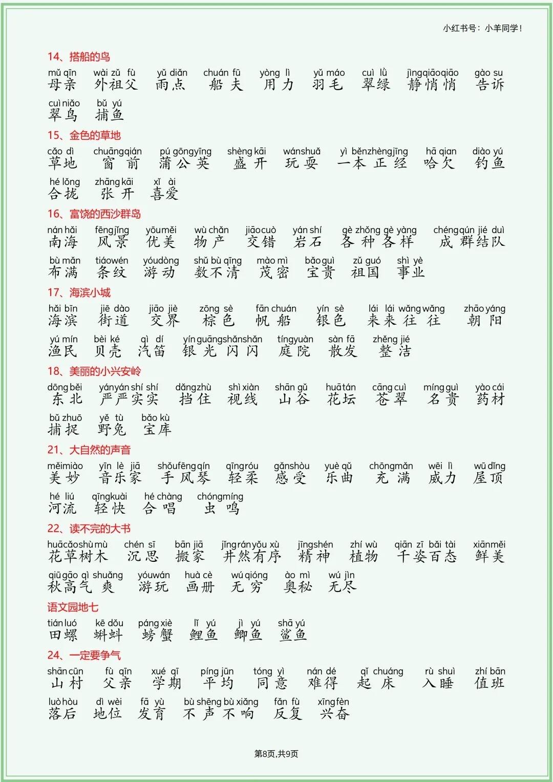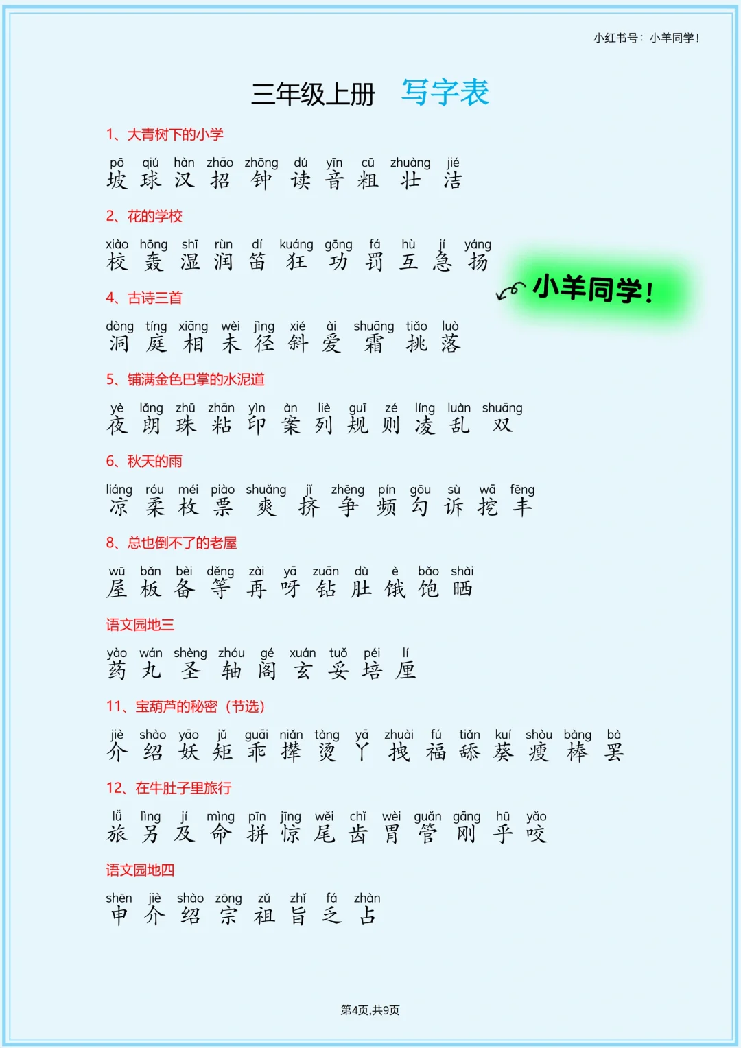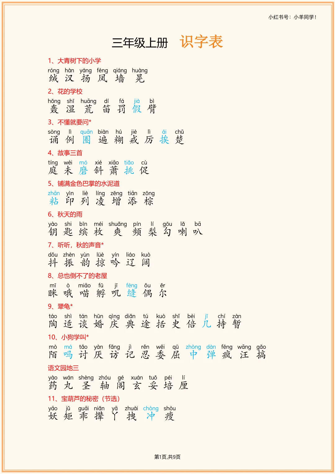 🔥三上教材改版,重做课后生字词表 家人们,谁懂啊!教材改版改得我头都大了🤯 原本整理好的三年级上册课后字表资料,现在全部都要重新做。真的好想哭😭 但一想到能帮孩子们用上最新、最准确的学习资料,又觉得一切都值得。 重新整理了这份三年级上册课后字表,第一时间分享给大家,希望能帮到正在为孩子语文学习发愁的家长们💪 由于资料是暑期定档,不保证和新书一字不差哦~~仅供预习呀~[扯脸H] ⚠️原创整理,禁止转载发布网络平台或商用。