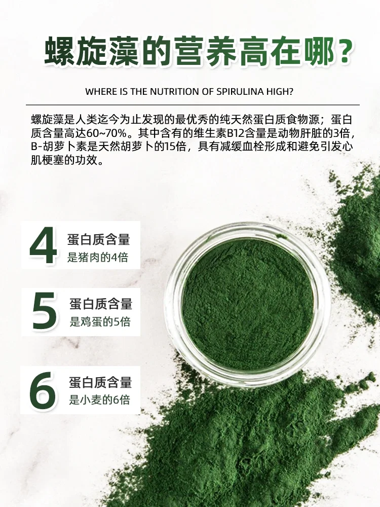 螺旋藻中的维生素B12含量是动物肝脏的3️⃣倍,人体利用率高达2️⃣0️⃣%。正常成年人每天只需食用3g螺旋藻,就能基本满足维生素B的摄取量[萌萌哒R];β-胡萝卜素是天然胡萝卜的1️⃣5️⃣倍,具有减缓血栓形成和避免引发心肌梗塞的功效。