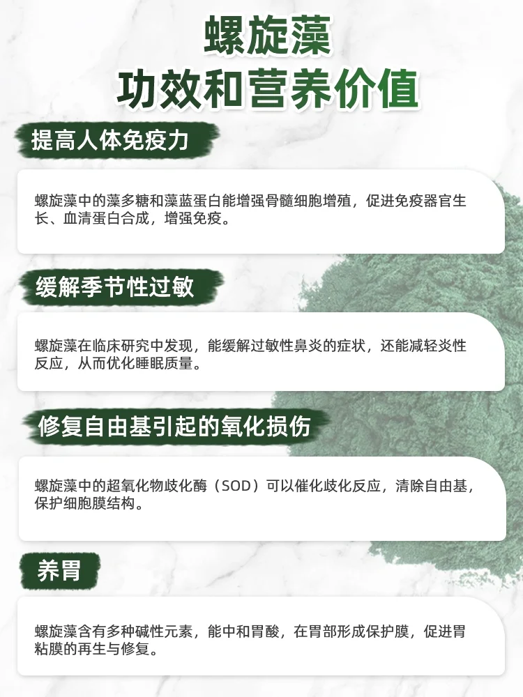 螺旋藻中的藻多糖和藻蓝蛋白能增强骨髓细胞增殖,促进免疫器官生长、血清蛋白合成,增强免疫。
