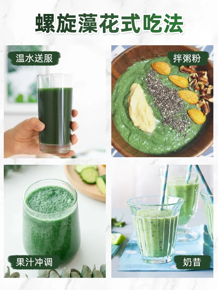 市面上的螺旋藻大多为片状或粉剂,片状需要温水吞服,粉剂的食用方法则比较多样: