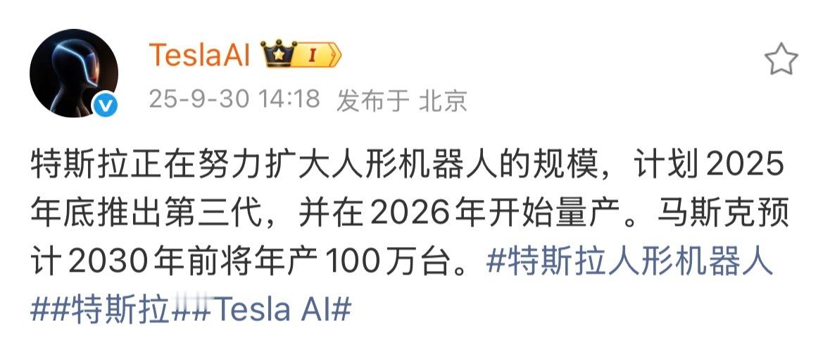 特斯拉正在努力扩大人形机器人的规模,计划2025年底推出第三代,并在2026年开始量产。马斯克预计2030年前将年产100万台。