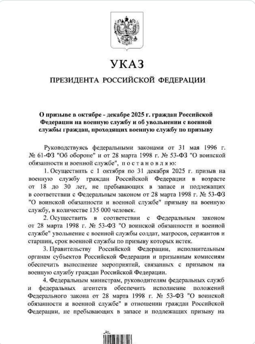 俄罗斯总统令启动,2025年秋季征兵:13.5万名18至30岁公民将入伍莫斯科 俄罗斯总统弗拉基米尔·普京于9月29日签署总统令,宣布2025年秋季征兵计划自10月1日起至12月31日实施,将征召13.5万名18至30岁的俄罗斯公民入伍。这是自2016年以来规模最大的秋季征兵行动,旨在补充武装力量人力储备。 根据总统令,征兵对象为无预备役身份、符合《兵役与军事服务法》条件的18至30岁男性公民,女性可自愿参军。征兵年龄上限自2023年起从27岁上调至30岁,以扩大兵源范围。学生、在读大学生、特定健康问题者及家庭唯一赡养人可获延期或豁免。收到征兵通知的公民将被禁止出境。征兵期为3个月,与俄罗斯传统春秋两季征兵制一致。同期,服役期满的士兵、海员及士官将退出现役,确保部队平稳轮换。俄罗斯国防部、地方征兵委员会及地方政府将协调执行,电子通知系统(Gosuslugi平台)将广泛应用。军方强调,新兵服役期为12个月,接受基础训练,不涉及乌克兰前线作战任务。数据对比 2025年秋季征兵人数较2024年秋季(13.3万人)略增,结合春季16万人的征召,全年总计超29.5万人,创近年新高。俄罗斯国防部表示,2024年征兵完成率接近100%,为今年计划奠定了基础。此令发布之际,俄罗斯国家杜马近期通过“全年征兵”法案首读,拟于2026年起实施连续征兵,缓解人力压力。自2022年俄乌冲突升级以来,俄军费激增至苏联时代水平,征兵规模年均增长5%,并通过高薪奖金吸引合同兵。乌克兰情报机构估计,2025年俄方还将从“特殊队伍”中抽调超12.6万人扩军。此次征兵令引发国际社会广泛关注,可能进一步加剧地缘政治紧张局势。