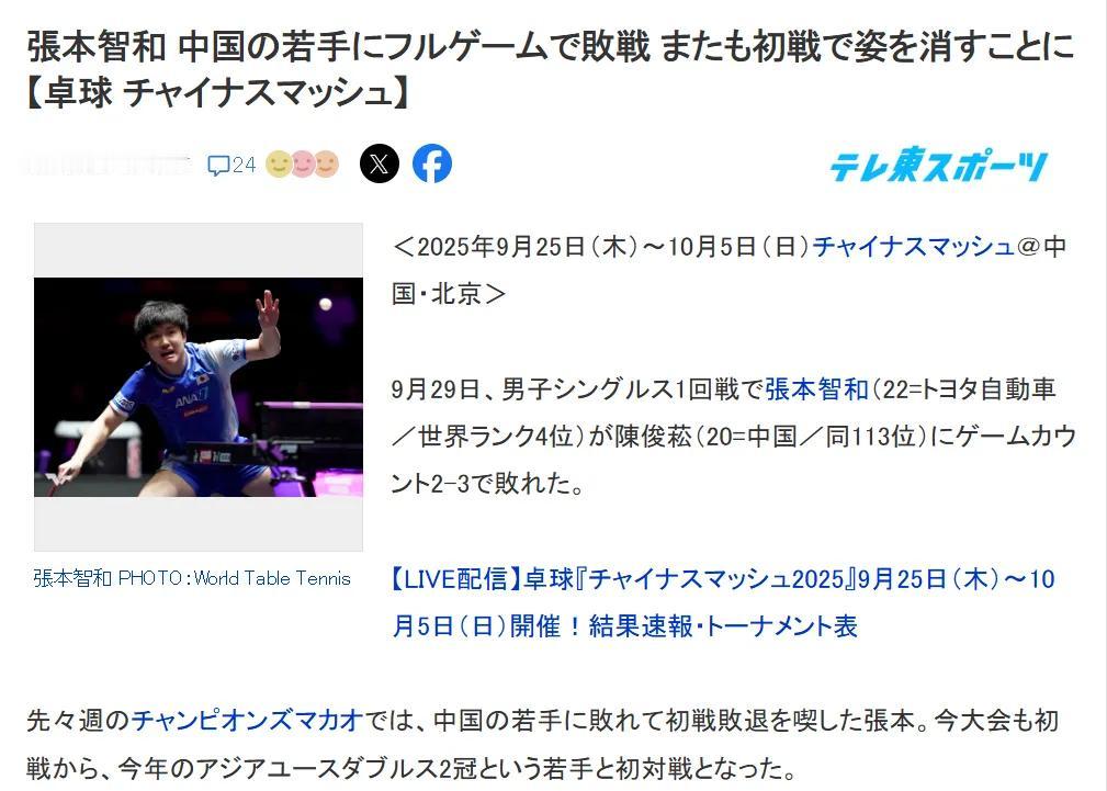 日本媒体和日本网友,也开始指责张本智和兄妹和他们的父母,说他们兄妹表现不稳定,特别是张本智和谁都敢赢谁都敢输,澳门冠军赛输薛飞一轮游,日本网友还接受觉得薛飞还有点名气,中国大满贯这次输排名一百多的小将陈俊菘一轮游,日本媒体网友都接受不了[捂脸][捂脸]开始指责他们全家,指责张本智和的父母不够纯粹,培养模式有问题,缺少日本运动员与生俱来的武道士精神[捂脸][捂脸][捂脸]真是好笑日本本土队员有武道士精神也没得冠军。日本武道士精神没有中国人与生俱来的爱国精神强大。 张本智和一家现在两边不讨好,里外不是人,横滨拿到冠军后,低调点尊重对手会比现在的处境好的多,自己失误啊。[捂脸][捂脸][捂脸]