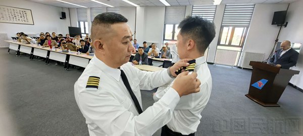 随后,授衔仪式将气氛推向高潮。在全体与会者的见证下,屈子恒、段云波、田雪松、鲁文杰等8名新学员代表依次上台,由飞行干部为他们佩戴上象征责任与使命的飞行肩章。银翼徽章在灯光下熠熠生辉,映照着年轻面孔上的激动与坚定。