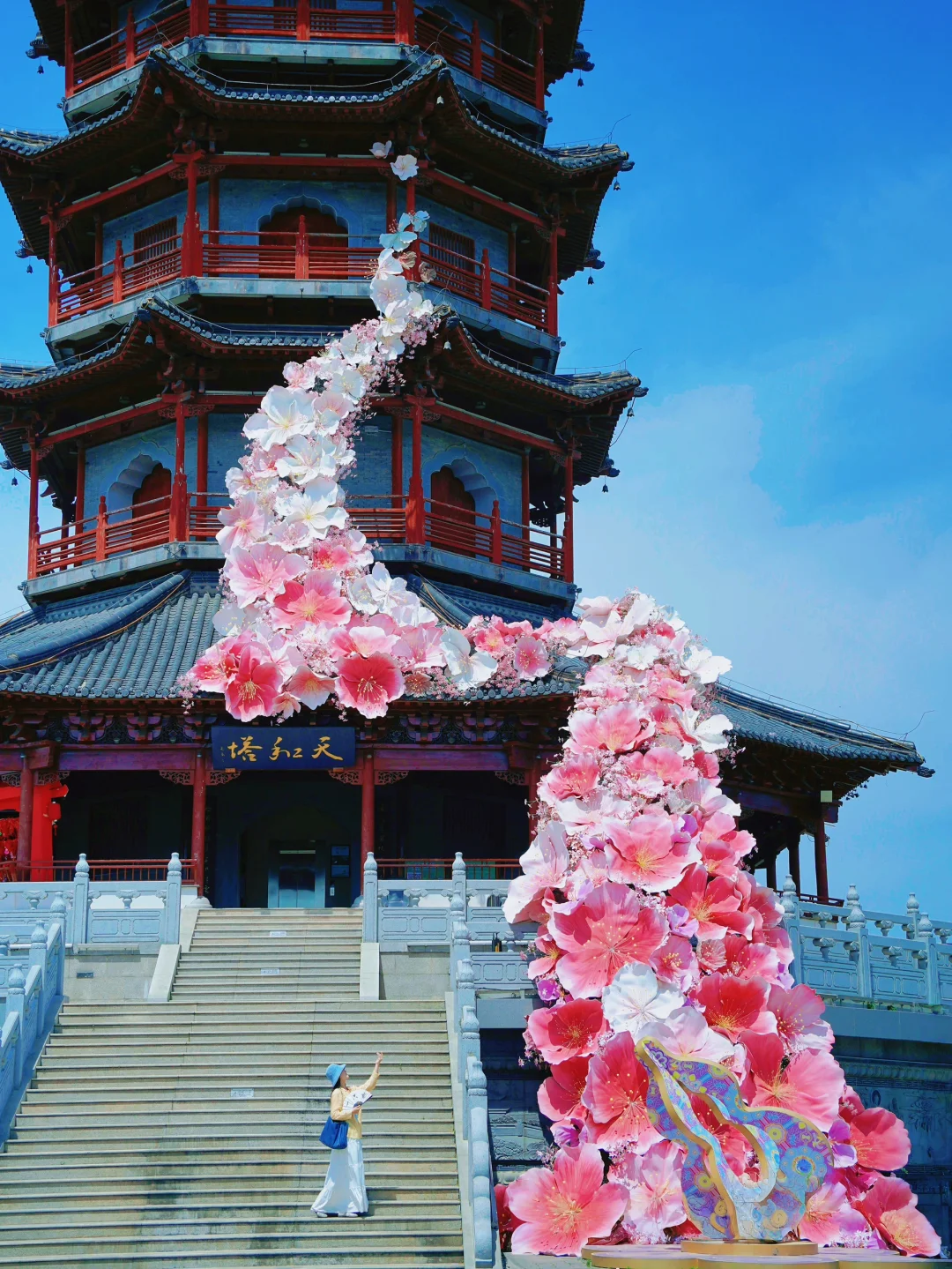 宋式建筑风格,塔高60米,雄伟庄严,电梯直接可以上塔,还有一个浪漫花瀑,拍照非常出片💐