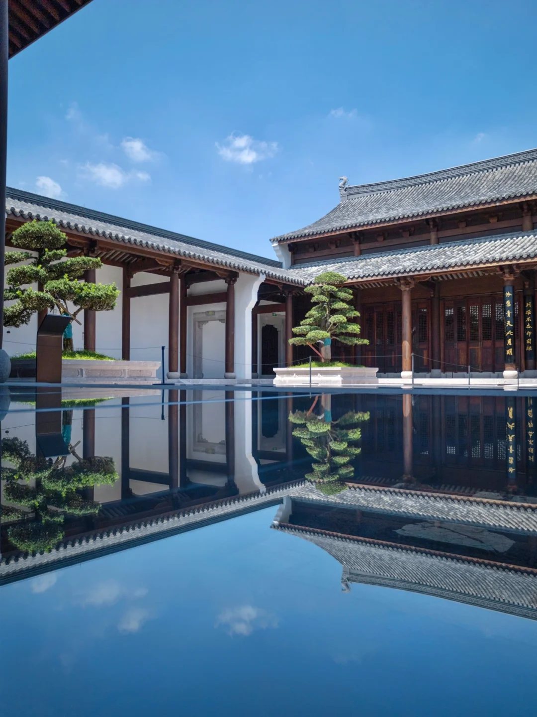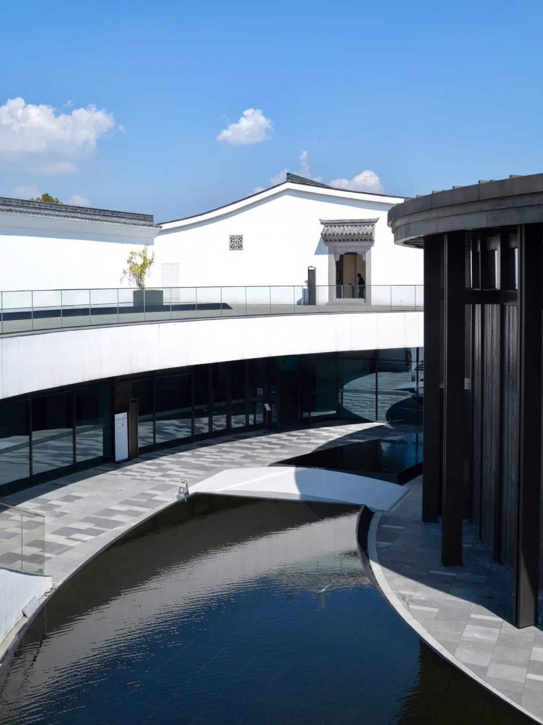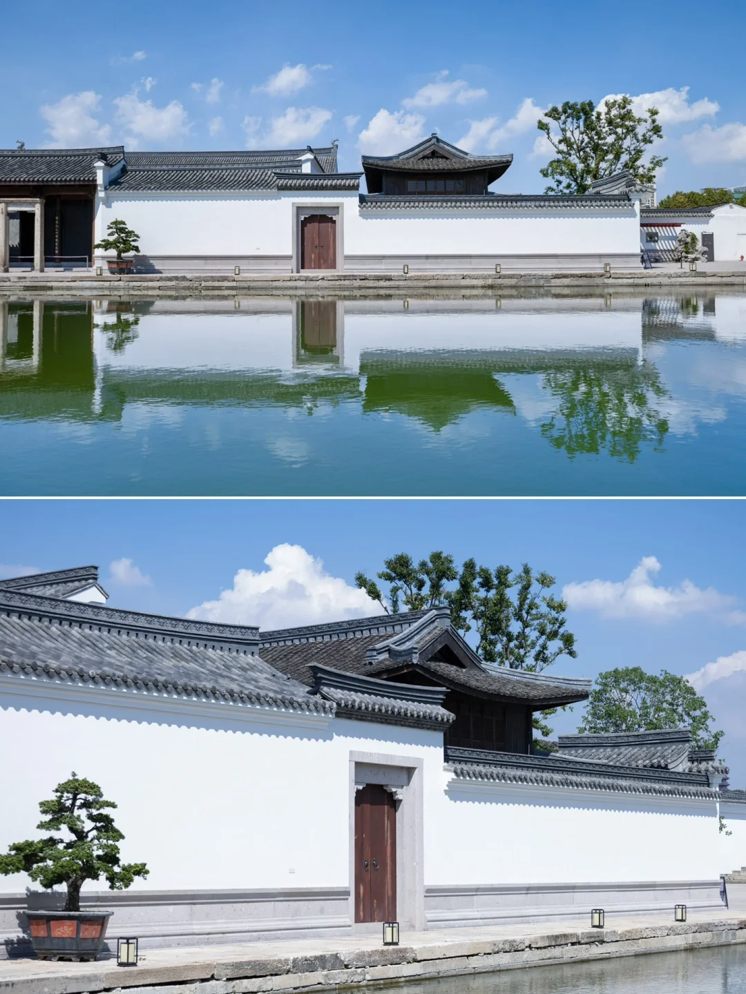 这里白墙黑瓦,引入水景、松柏等江南元素