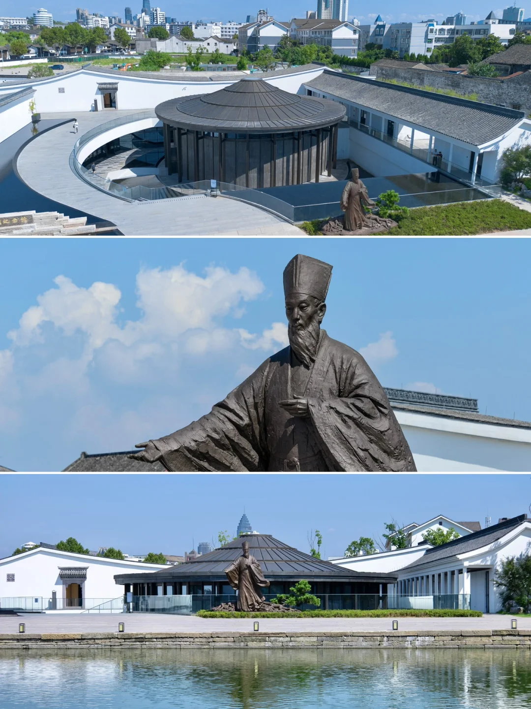 纪念馆则是下沉式的圆柱形建筑,纪念馆内有阳明文化数字文献厅、陈列厅、影厅、心源厅和文创体验区,通过光影等媒体技术,展现阳明心学的发展历程。